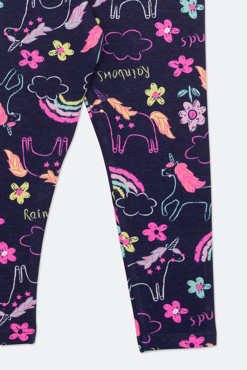Calça legging infantil. A peça possui estampa e elástico aplicado no cós.