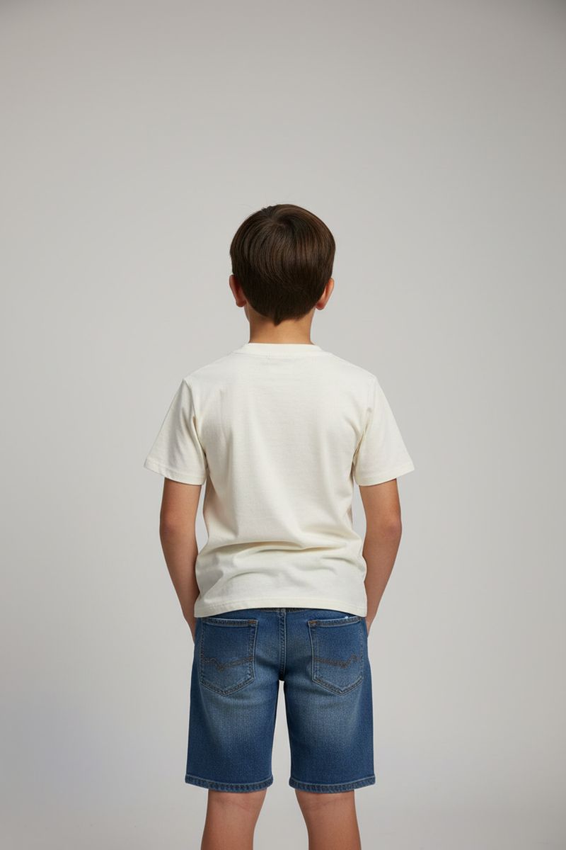 Combine esta camiseta infantil com shorts jeans para um visual despojado e moderno, como os shorts jeans azul claro com barras dobradas. Para um look mais arrumado, opte por calças de sarja coloridas. Complete com tênis confortáveis ou sandálias e uma jaqueta leve para um toque extra de estilo.