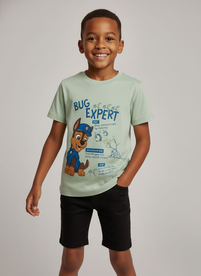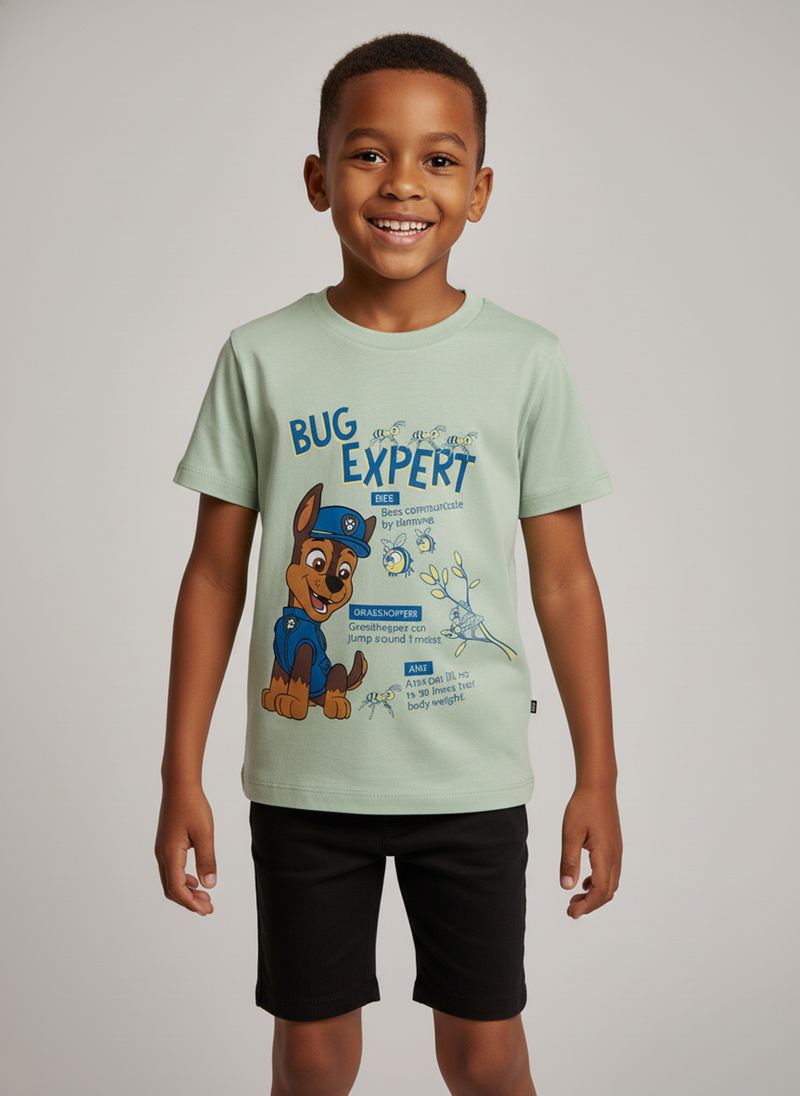 A Camiseta Infantil Patrulha Canina Chase "Bug Expert" Caedu, em 100% algodão e meia malha, oferece conforto e durabilidade. Com estampa vibrante do Chase, esta roupa infantil verde claro é ideal para pequenos exploradores e diversão.