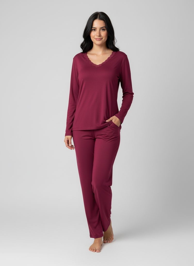 Desfrute de noites tranquilas com o Pijama Feminino Longo Conforto Marsala Caedu. Confeccionado em POLYBRUSH, oferece toque suave e caimento perfeito, ideal para quem busca roupas caedu que unem bem-estar e estilo. Seu decote V em renda adiciona um charme delicado, elevando sua experiência de relaxamento com um toque de moda.