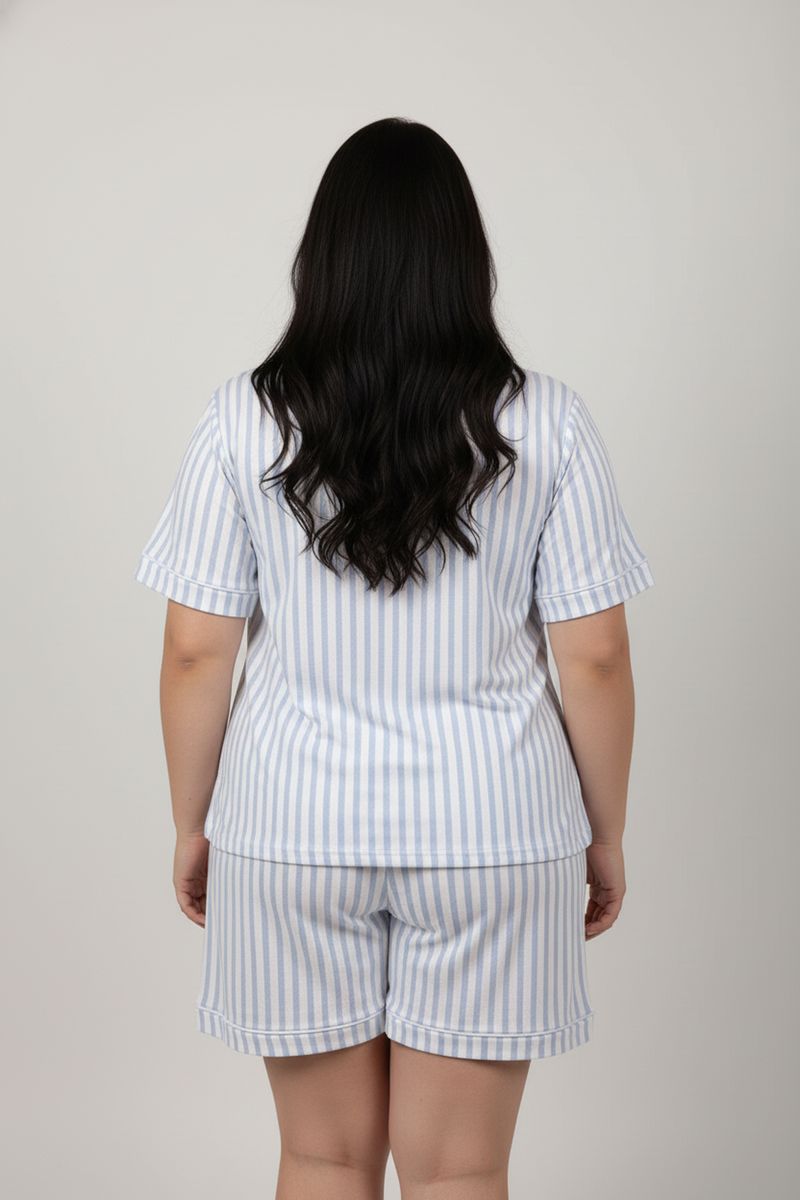 Desfrute de noites tranquilas e momentos relaxantes com o Pijama Feminino Americano Caedu. Confeccionado em meia malha, este conjunto listrado azul e branco oferece conforto e estilo. A blusa de manga curta e o shorts garantem leveza para seus dias em casa.