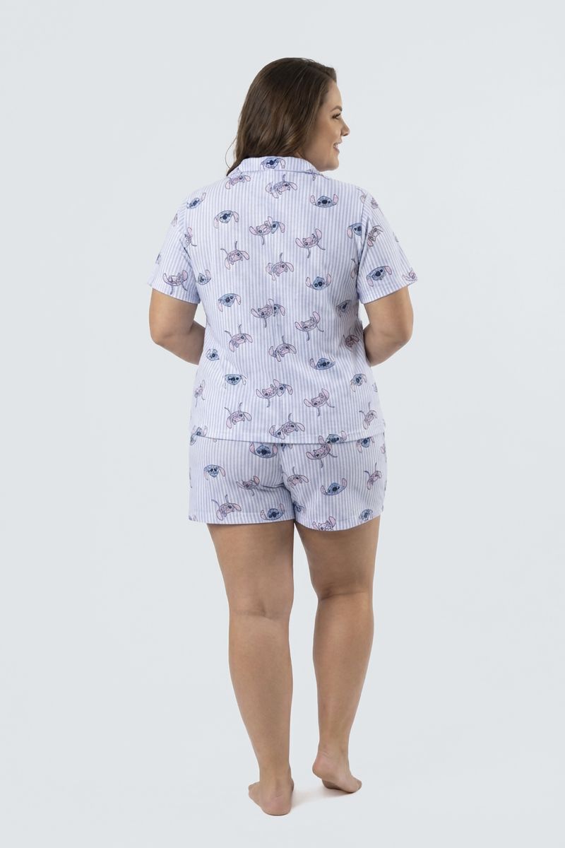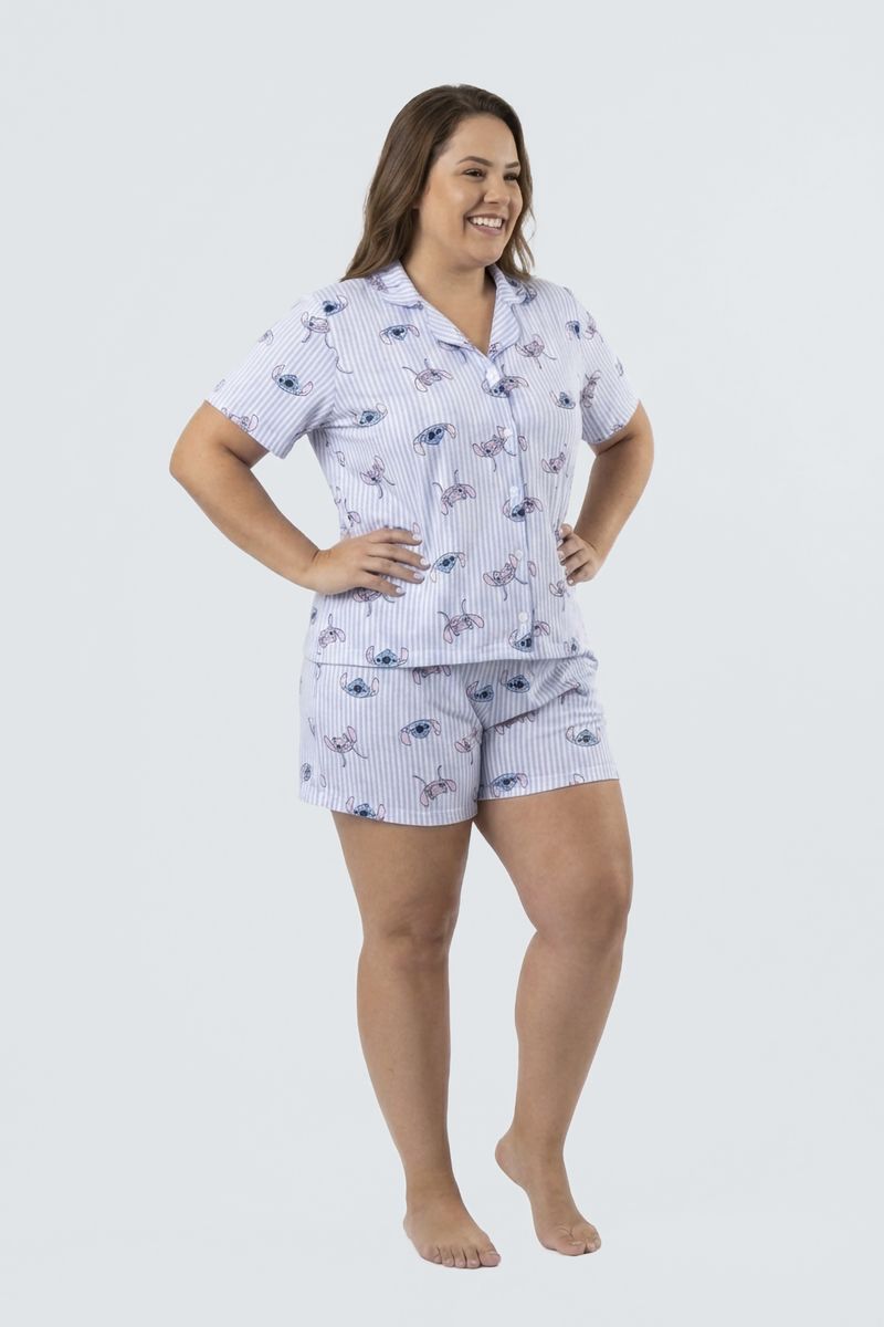 Desfrute de noites tranquilas e cheias de estilo com o Pijama Feminino Curto Listrado Stitch Caedu. Este conjunto de blusa e short em meia malha oferece conforto superior, com estampa divertida do Stitch e design listrado, perfeito para seus momentos de descanso.