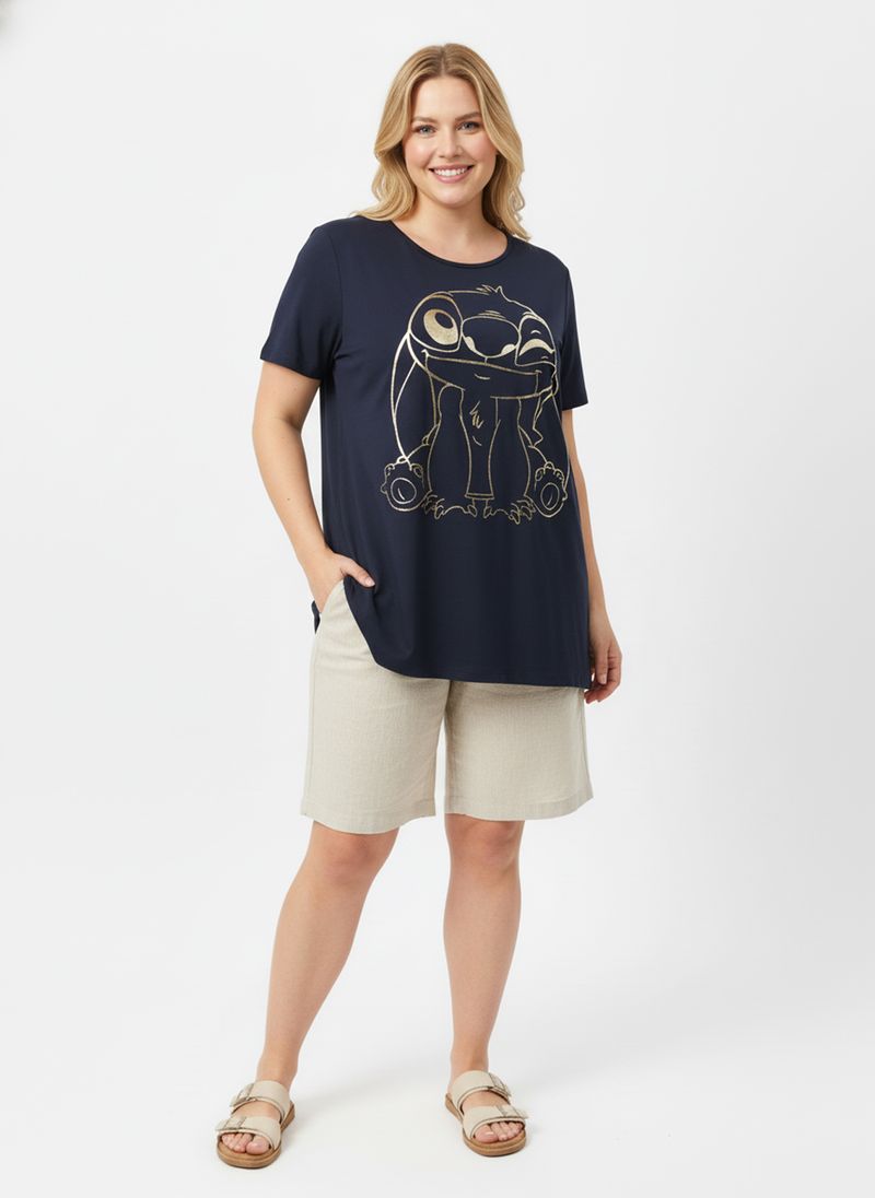 Desperte a magia com a Camisola Pijama Disney Stitch Foil Azul Escuro Caedu. Em viscolycra, oferece conforto inigualável para suas noites. A estampa vibrante do Stitch em foil adiciona um toque de encanto Disney, ideal para relaxar.