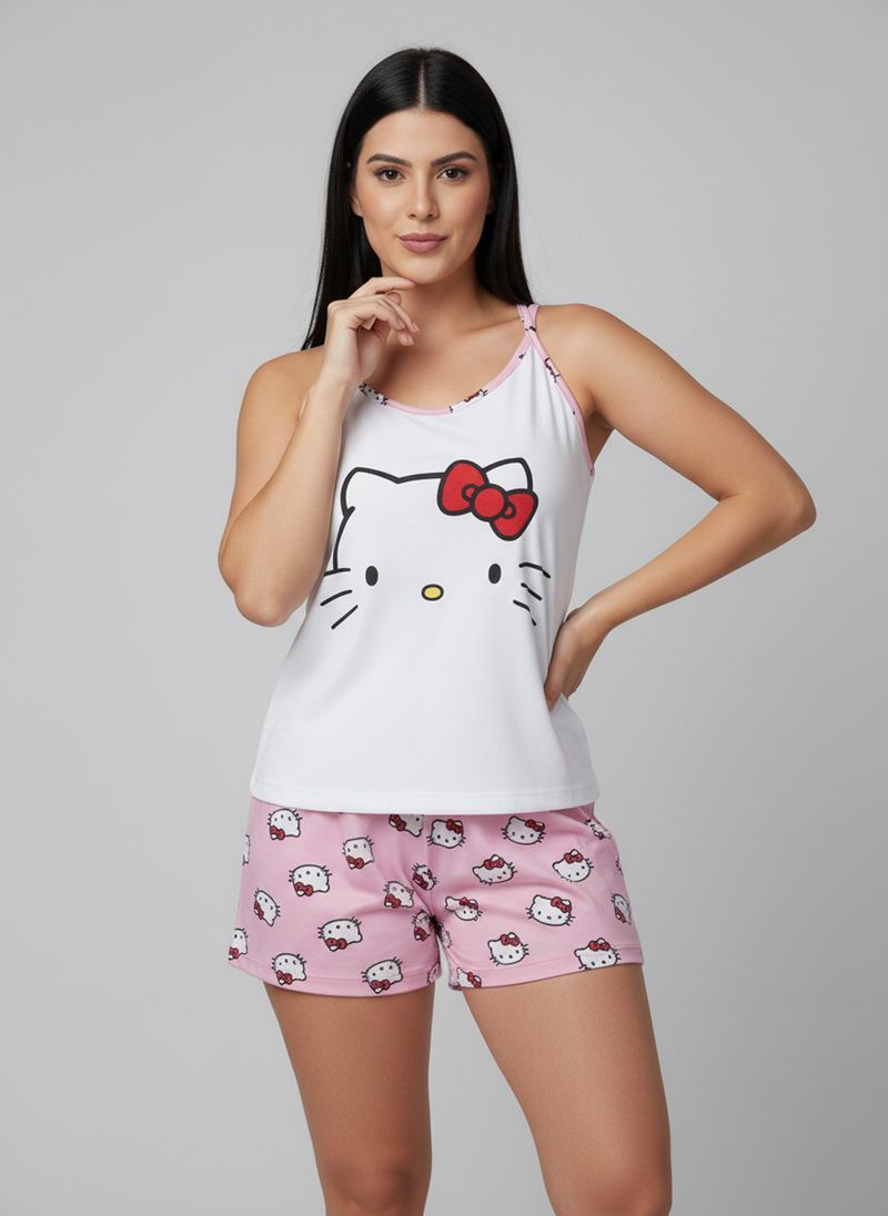 Desfrute de conforto e estilo com o Conjunto Pijama Hello Kitty Caedu. Em meia malha, esta roupa com blusa de alças branca e shorts rosa estampado da Hello Kitty é ideal para relaxar.