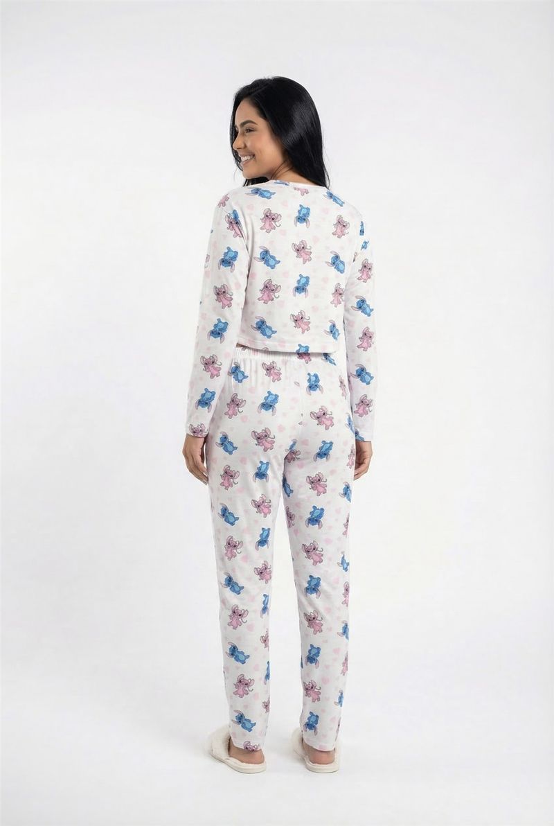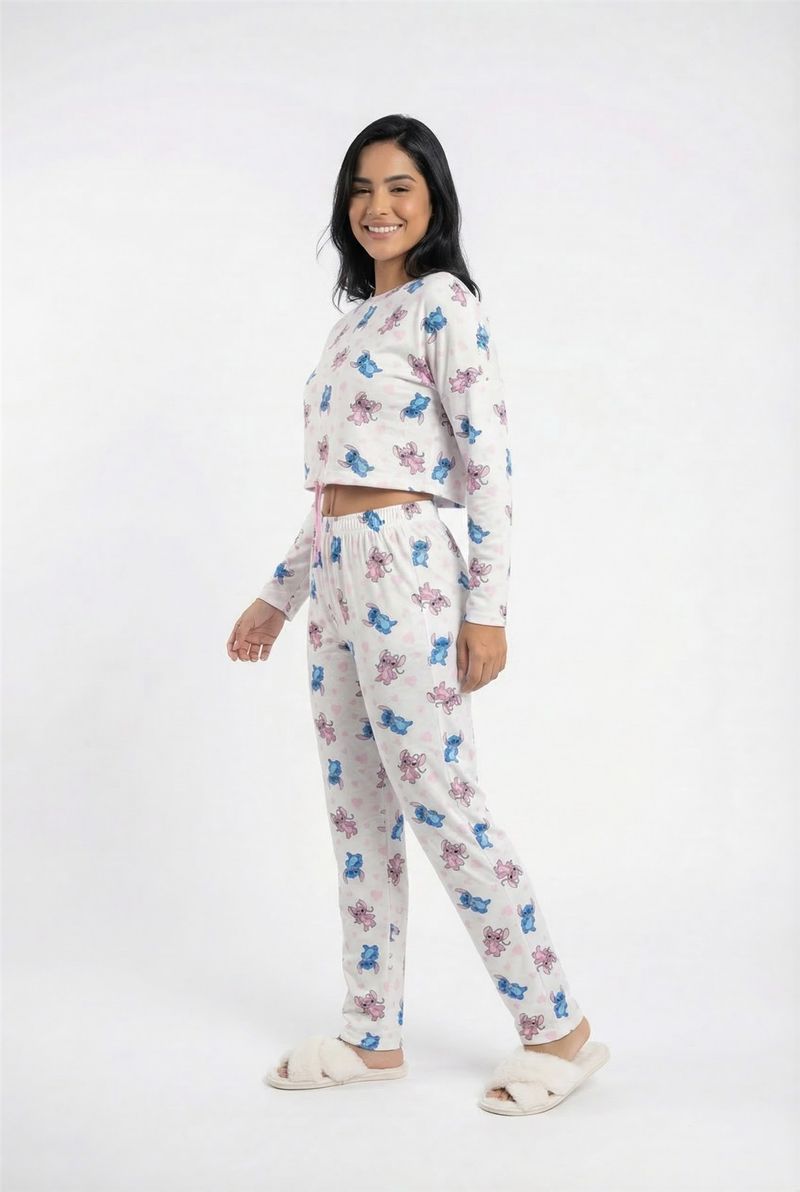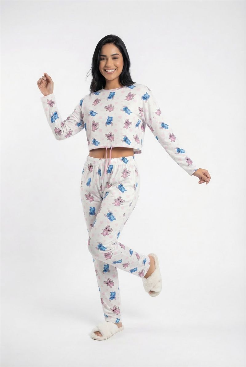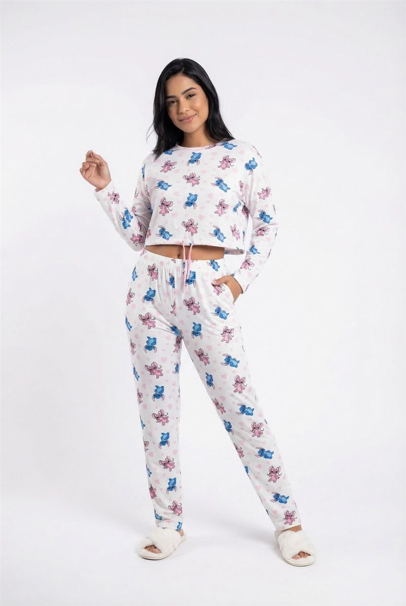 Conforto e diversão se encontram no Pijama Feminino Divertido Stitch & Angel Caedu. Este conjunto estampado de polybrush, com blusa cropped manga longa e calça longa, é ideal para seus momentos de relaxamento. Alegre e aconchegante.