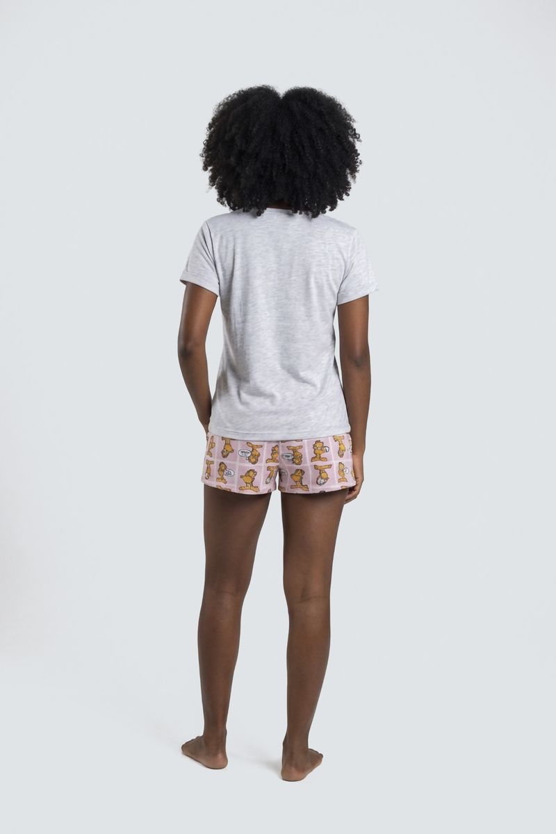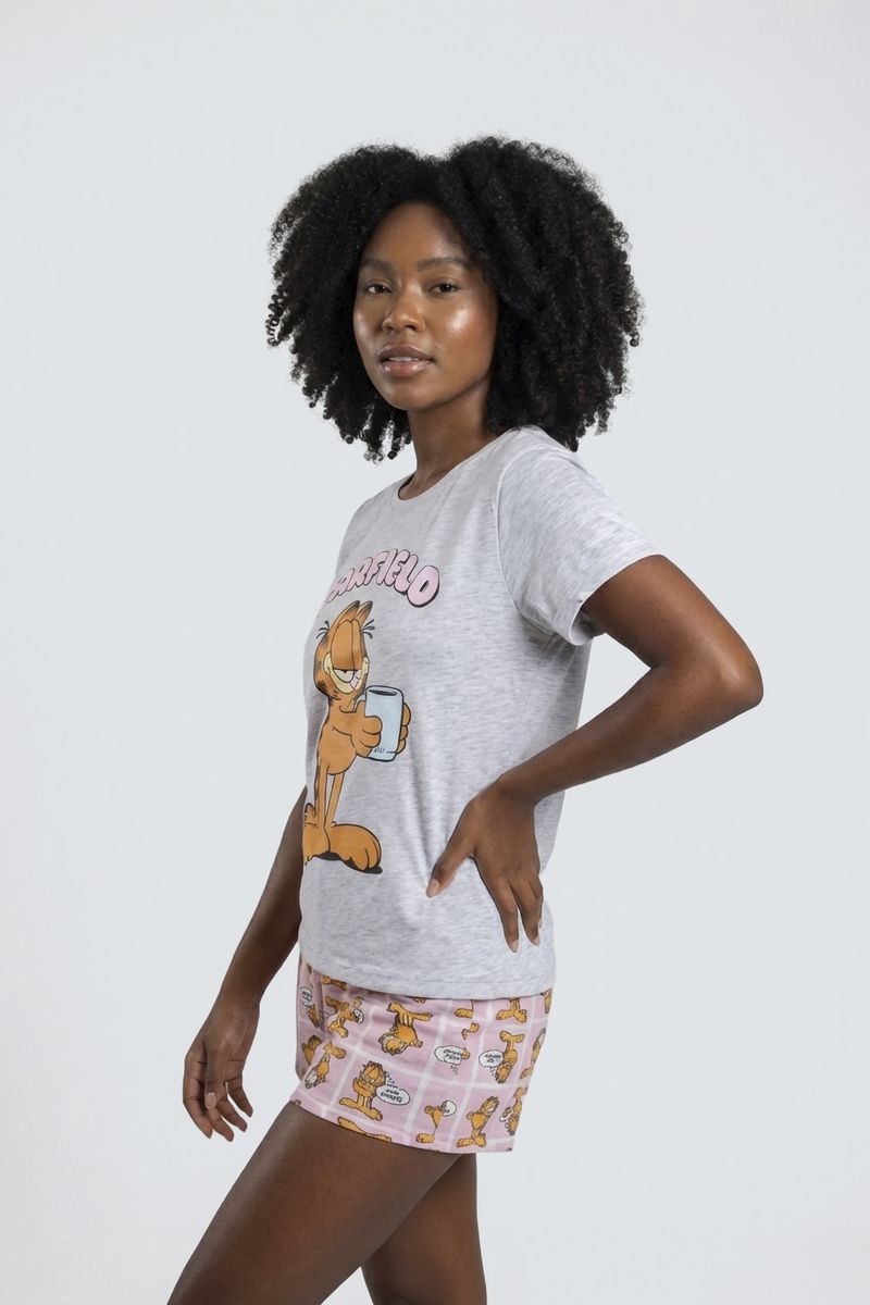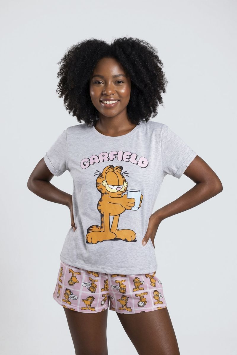 Desfrute de conforto e diversão com o Pijama Feminino Curto Garfield Caedu. Este conjunto de roupa em meia malha, com blusa cinza mescla e estampa do Garfield, e short rosa xadrez, é ideal para relaxar.