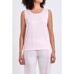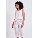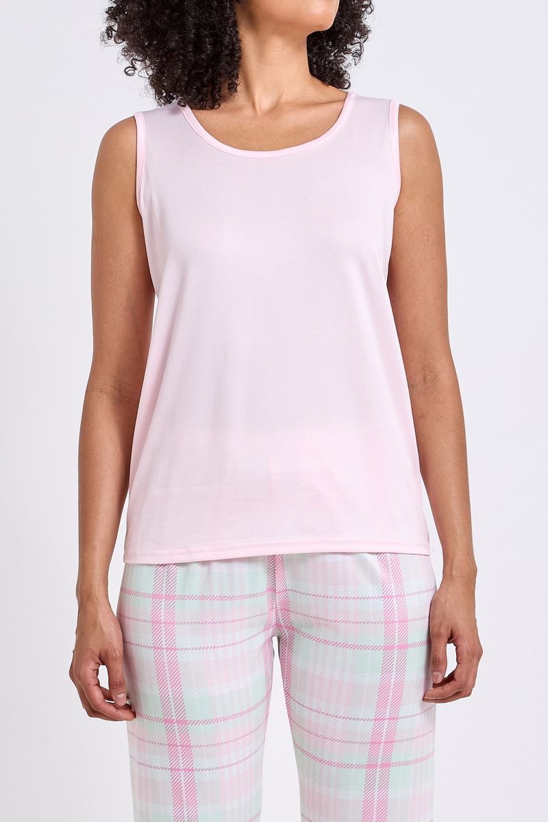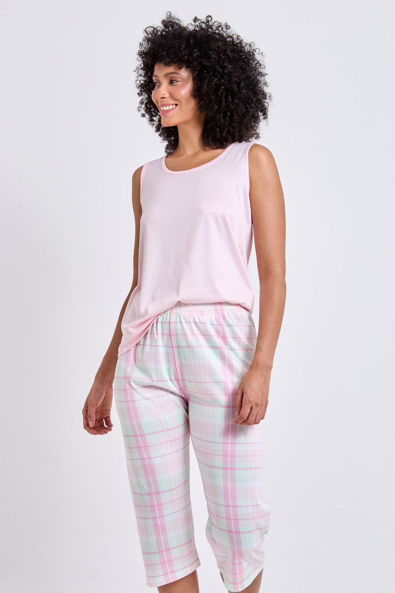 Conforto e estilo para suas noites! O Pijama Feminino Capri Caedu, em Polybrush (95% poliéster, 5% elastano), tem regata rosa lisa e capri xadrez rosa e verde. Toque suave e caimento ideal para relaxar.