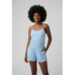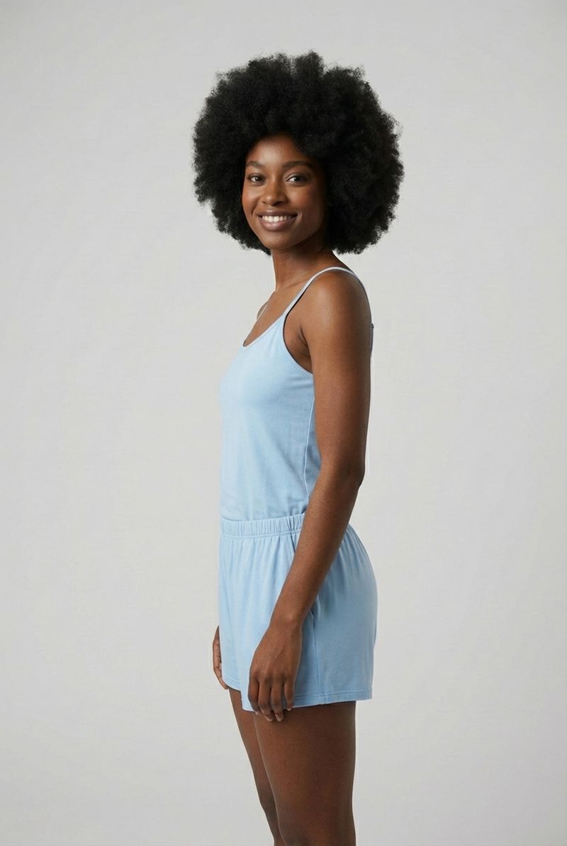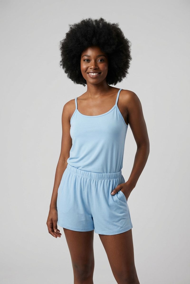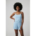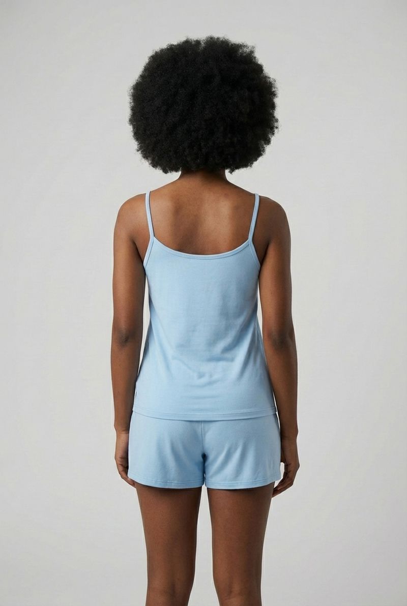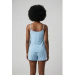 Pijama Feminino Curto Caedu, um conjunto azul céu que abraça seu corpo. Composto por blusa de alça fina e short com bolsos, este pijama em polybrush oferece toque suave e caimento perfeito para seus momentos de descanso. Uma