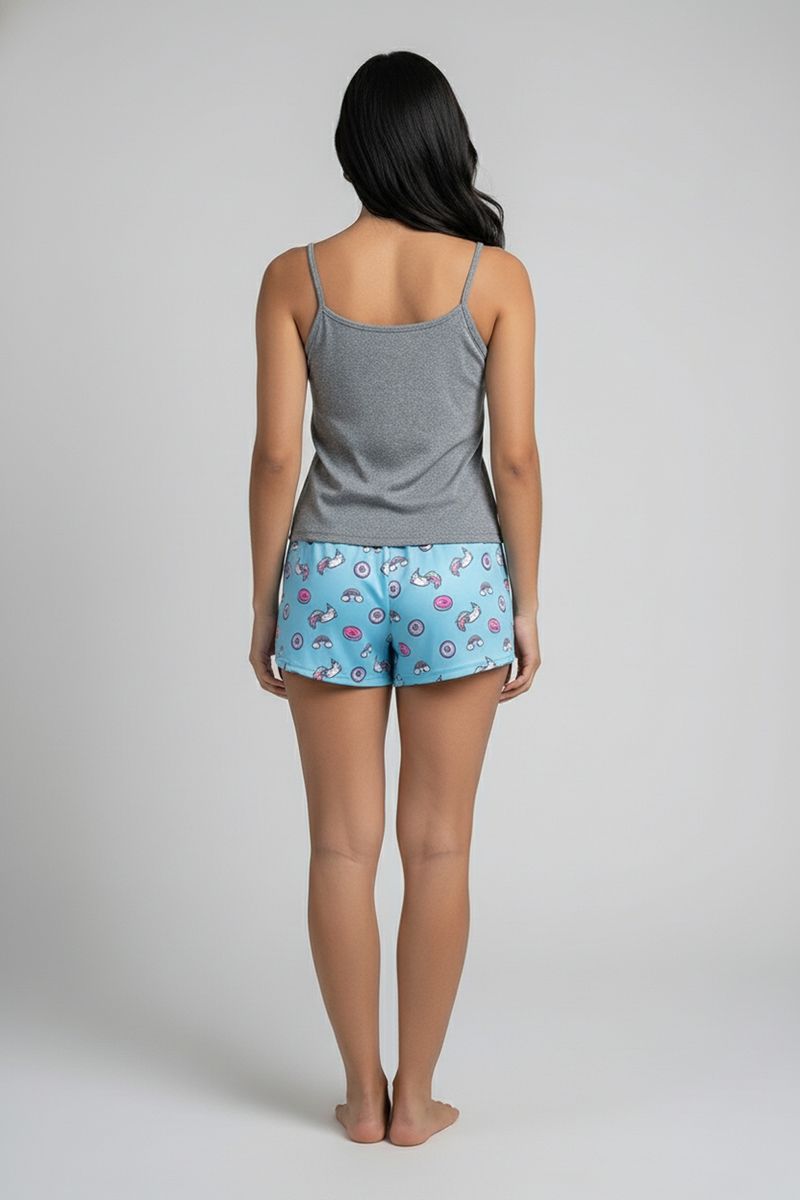 Desfrute do máximo conforto com o Pijama Feminino Caedu. Este conjunto de regata lisa e shorts estampado com donuts e arco-íris é perfeito para seus momentos de relaxamento. Feito em POLYBRUSH, oferece toque suave e caimento perfeito, unindo estilo e bem-estar para suas noites.