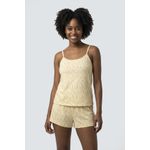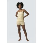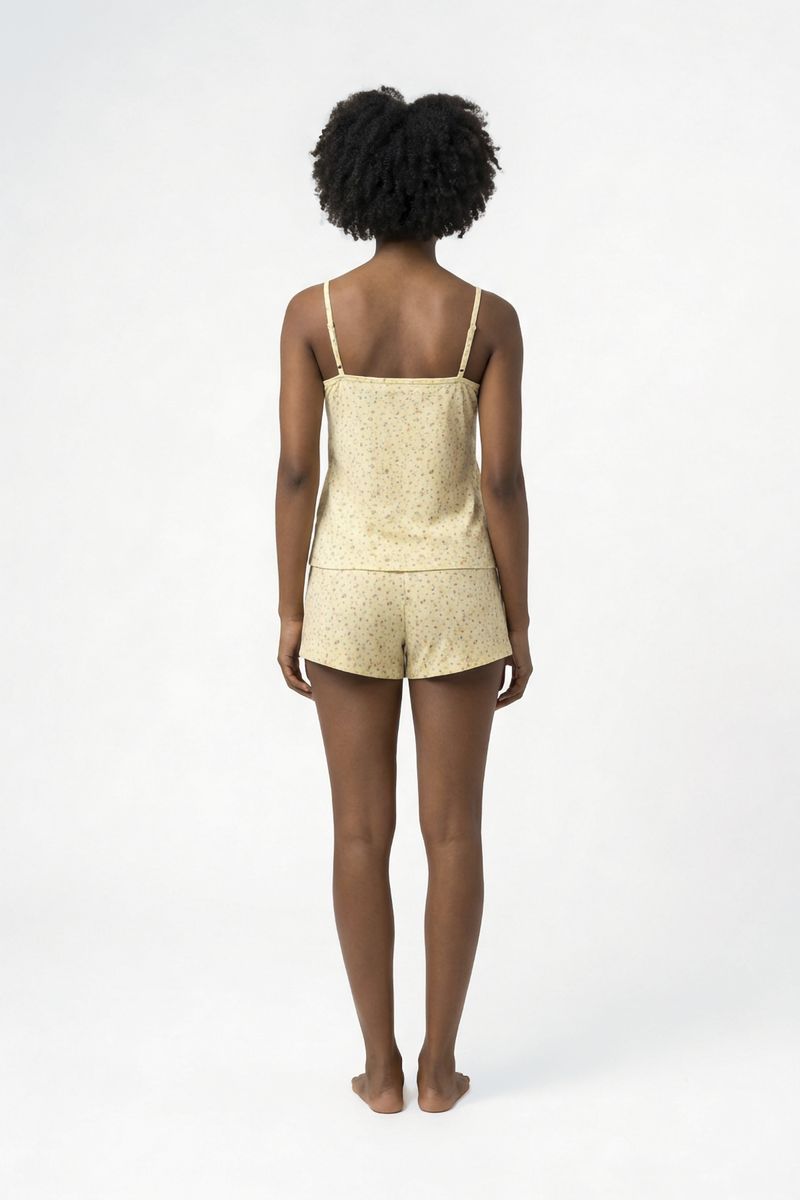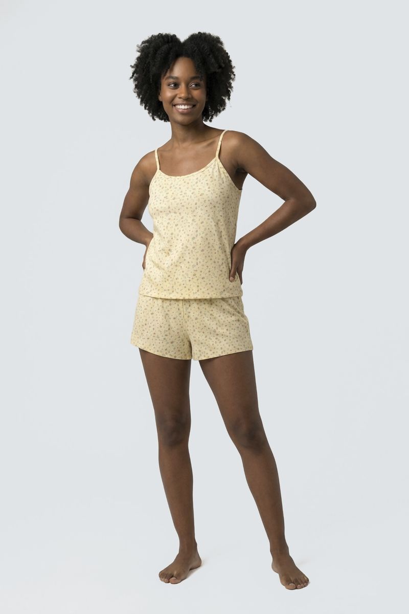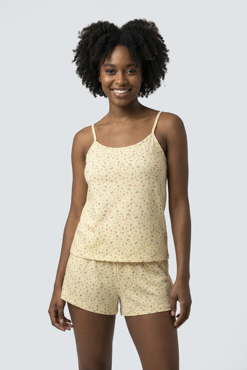 Desfrute de noites agradáveis com o Pijama Feminino Curto Caedu. Este conjunto de blusa com alças e short, em polybrush macio, possui uma estampa floral delicada em amarelo suave. Conforto e estilo para sua moda íntima.