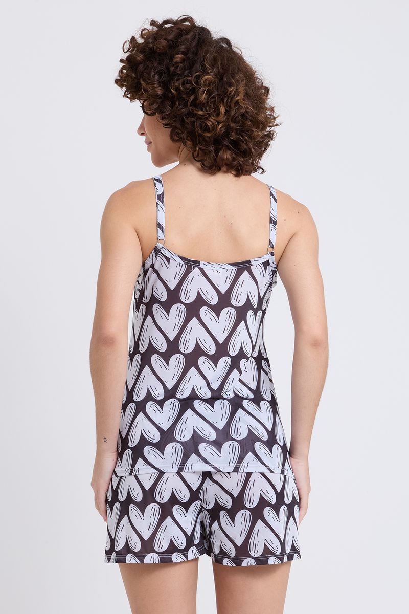 Sinta o conforto leve do Pijama Feminino de Alça Ligan Estampa Corações Caedu. Este conjunto estampado, em liganete (95% poliéster, 5% elastano), oferece um toque suave e caimento perfeito. Ideal para relaxar, este pijama feminino combina estilo e bem-estar em suas noites.
