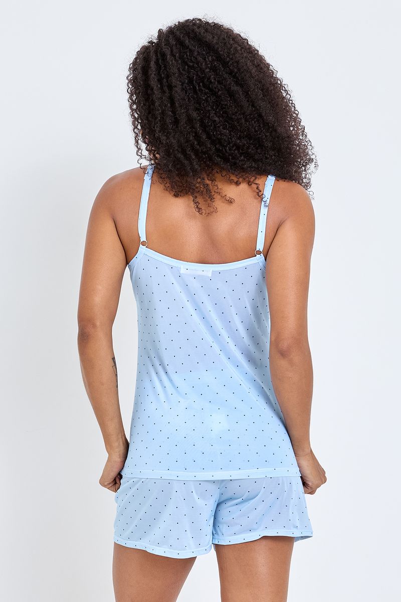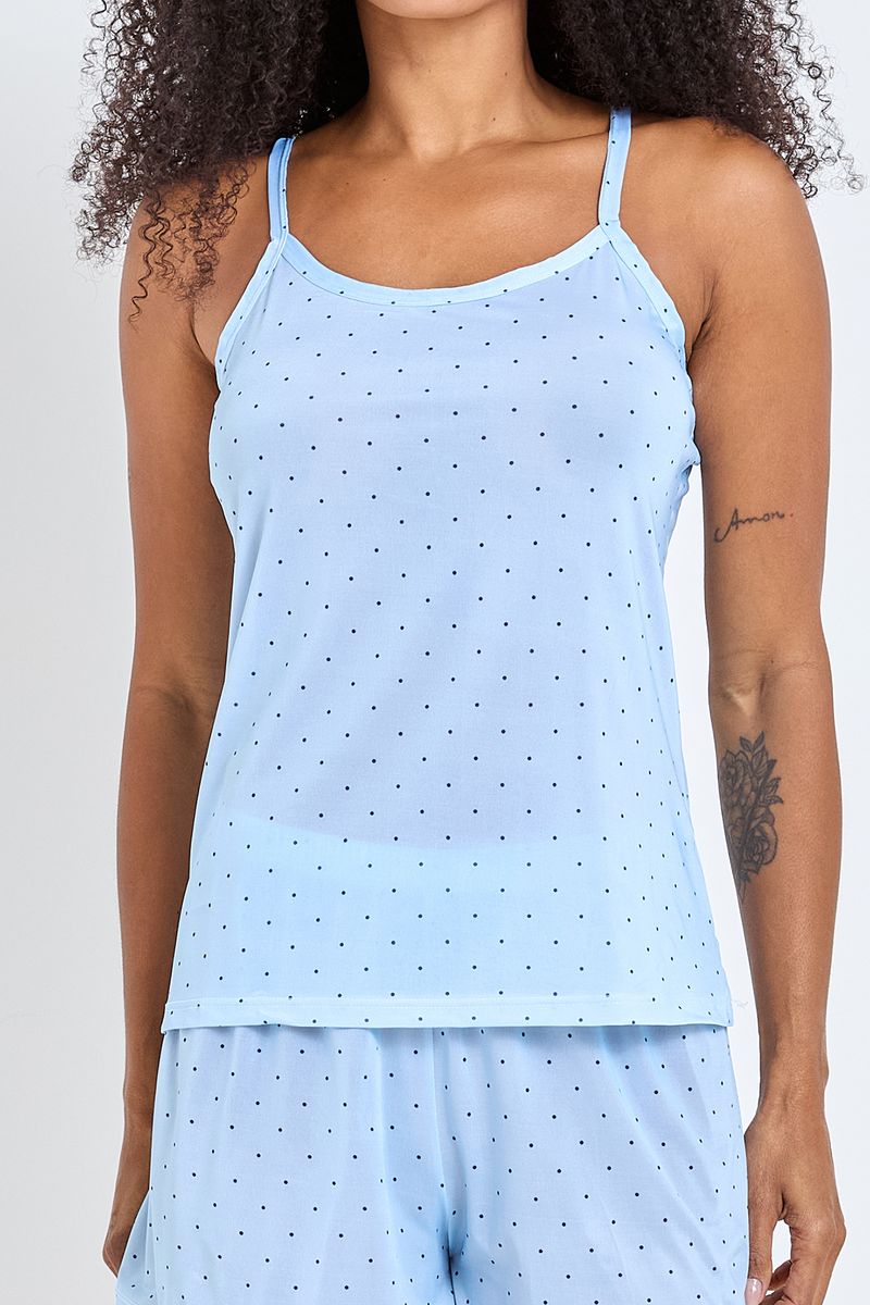 Desfrute de noites tranquilas com o Pijama Feminino Liganete Alça Azul Poá Caedu. Confeccionado em liganete suave, este conjunto estampado de blusa de alça e short oferece máximo conforto e um toque de delicadeza. Ideal para quem busca roupa de dormir leve e charmosa.