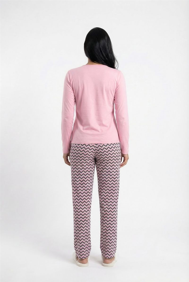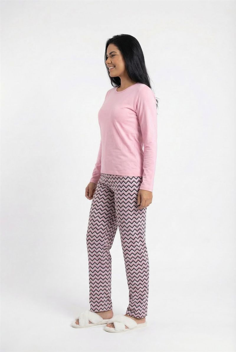 Pijama Feminino Caedu, um conjunto que une estilo e bem-estar. Composto por blusa rosa de manga longa e calça estampada em chevron, este conjunto de