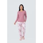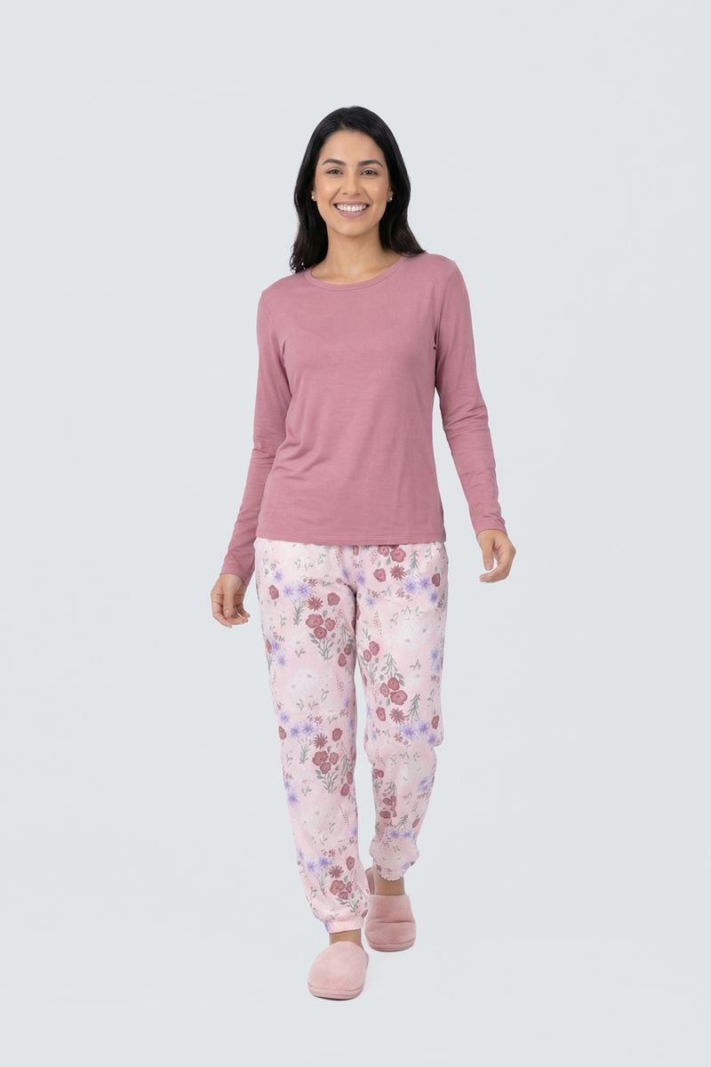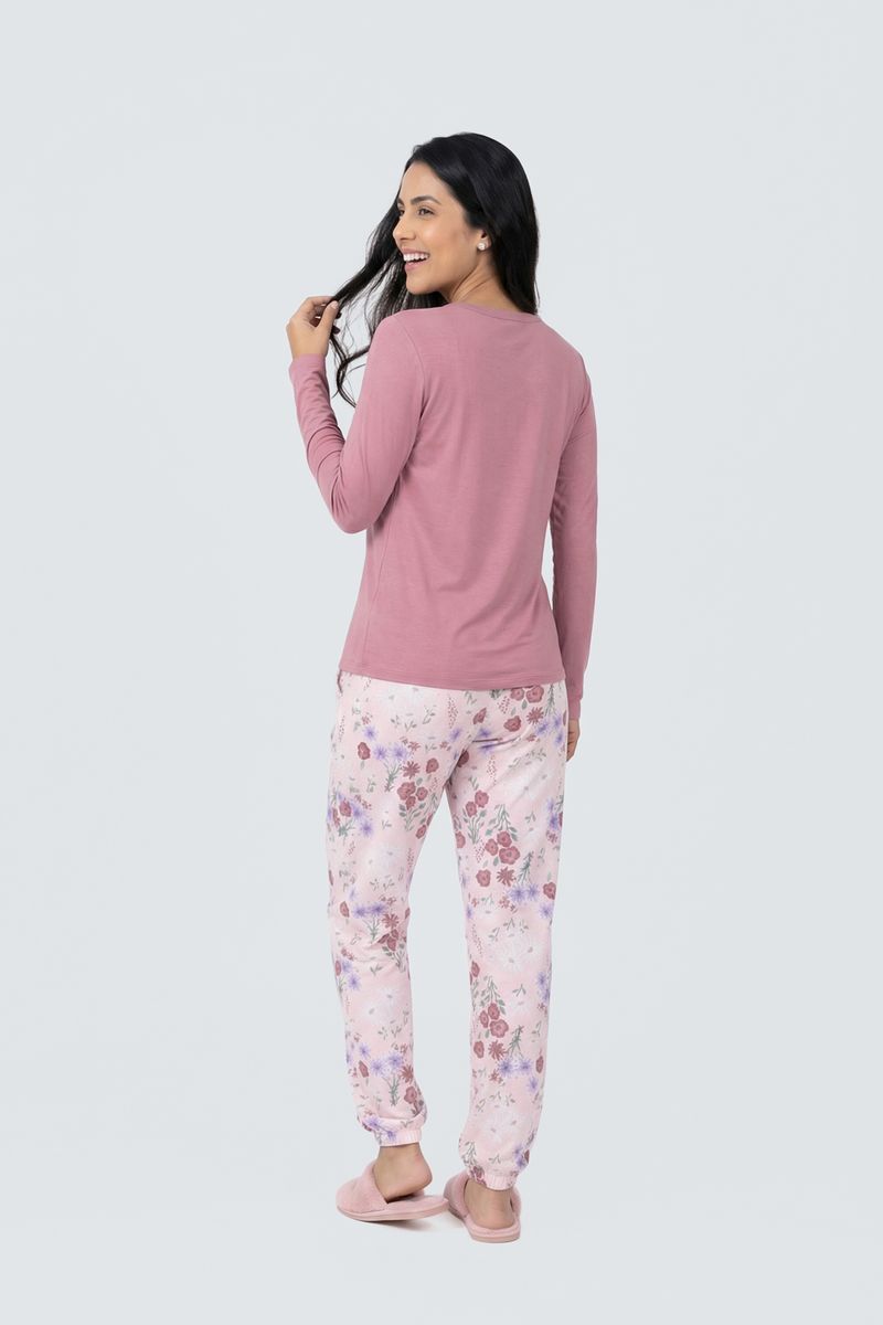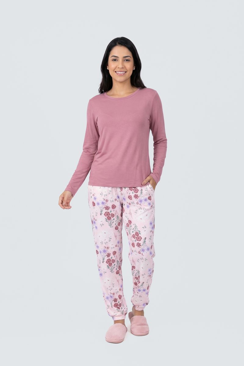 Detalhes: Blusa rosa sólida, calça estampada floral vibrante com fundo rosa claro, bolso lateral na calça