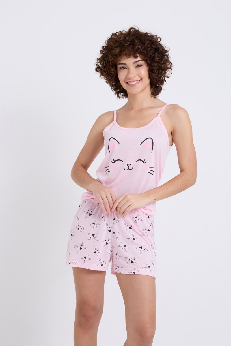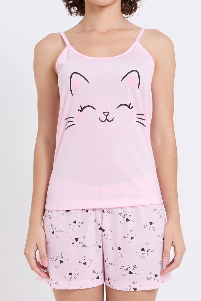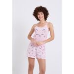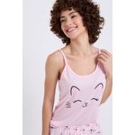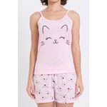 Sinta o conforto e a doçura do Pijama Feminino Caedu. Este conjunto em meia malha rosa claro, com regata de gatinho e shorts estampado, é perfeito para seus momentos de descanso. Uma roupa charmosa e divertida para você.