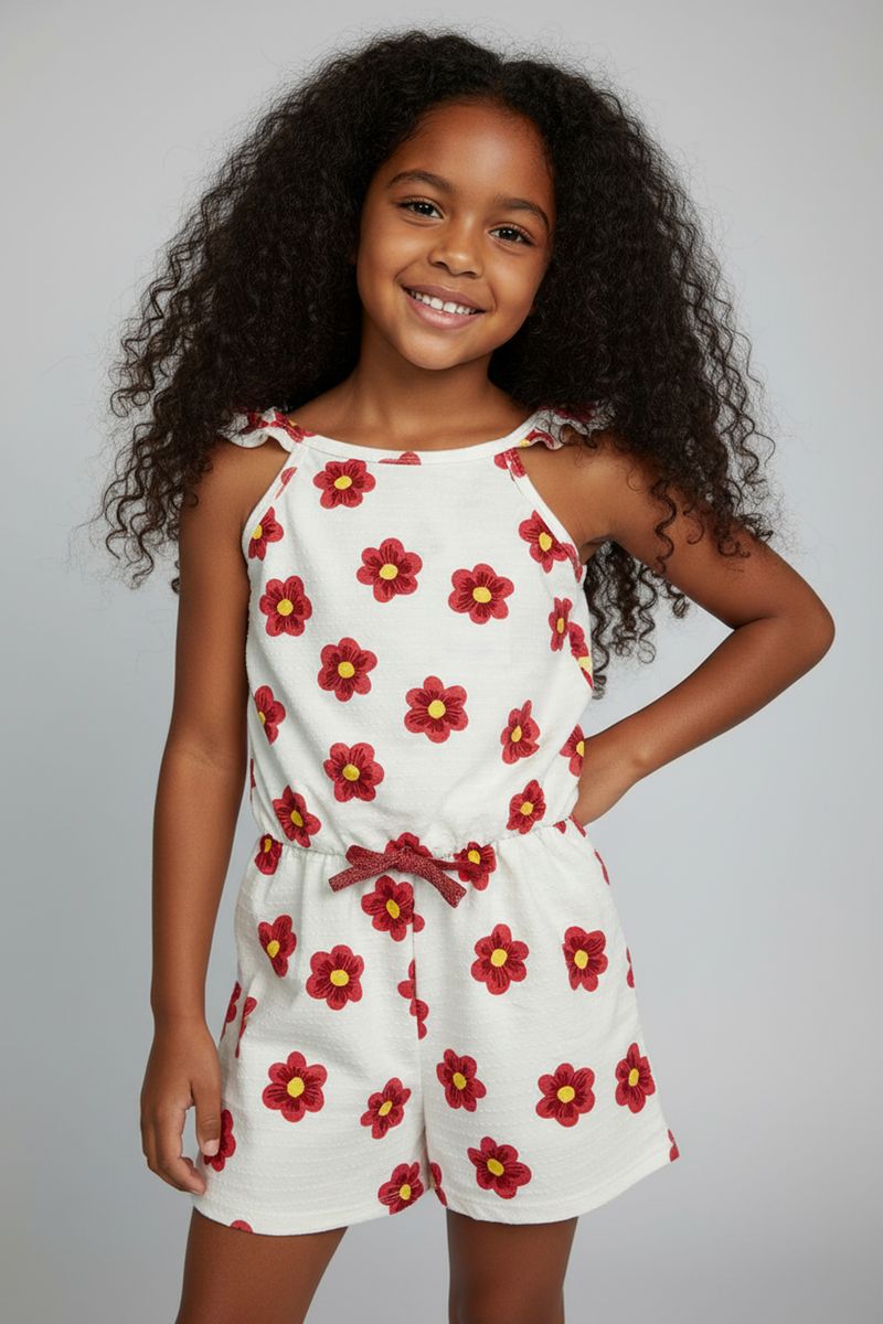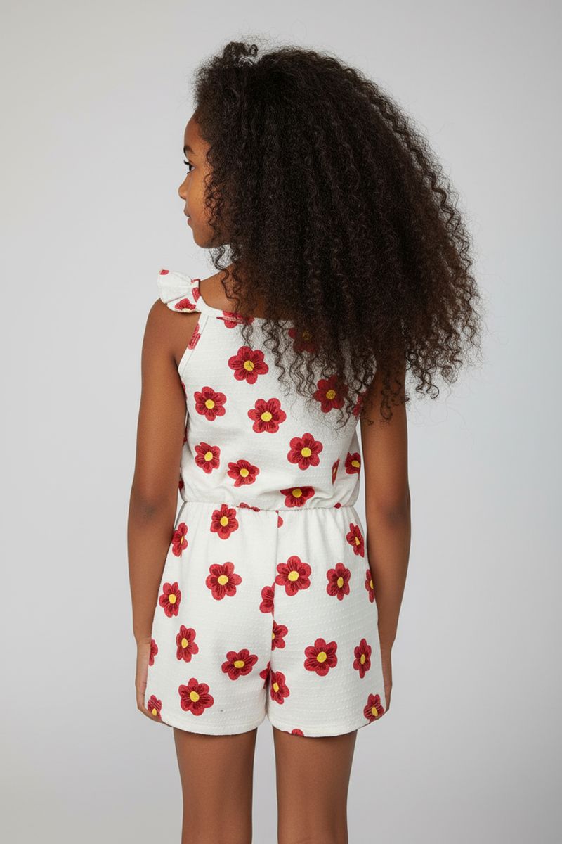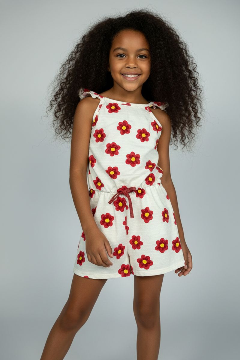 Desperte a alegria da sua pequena com o Macaquinho Infantil Caedu. Confortável e cheio de estilo, este macaquinho off white com vibrantes flores vermelhas e delicadas alças de babado é perfeito para momentos de pura diversão. Uma roupa que une beleza e liberdade para sua criança.