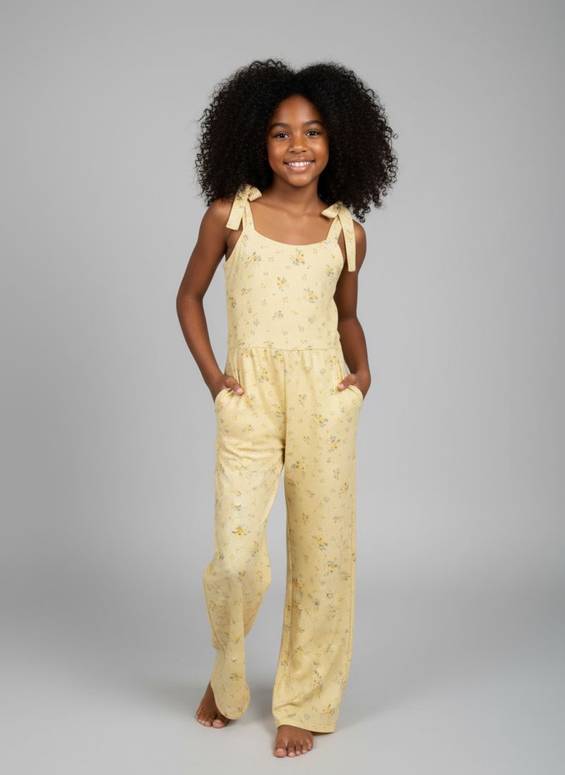 Combine o Macacão Infantil Amarelo Sol Floral com sandálias ou sapatilhas para um look casual e confortável. Para um toque extra de estilo, adicione uma jaqueta jeans em dias mais frescos ou um cardigan leve. Complete com acessórios de cabelo delicados para um visual encantador e completo.
