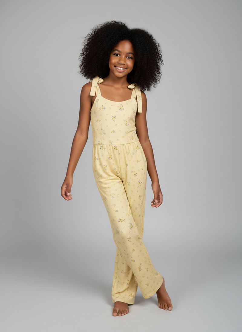 Desperte o encanto com o Macacão Infantil Caedu Amarelo Sol Floral! Com estampa floral delicada e brilho sutil de Lurex, esta peça 100% poliéster oferece conforto e estilo. As alças de laço e o decote quadrado adicionam um toque charmoso, perfeito para as pequenas fashionistas.