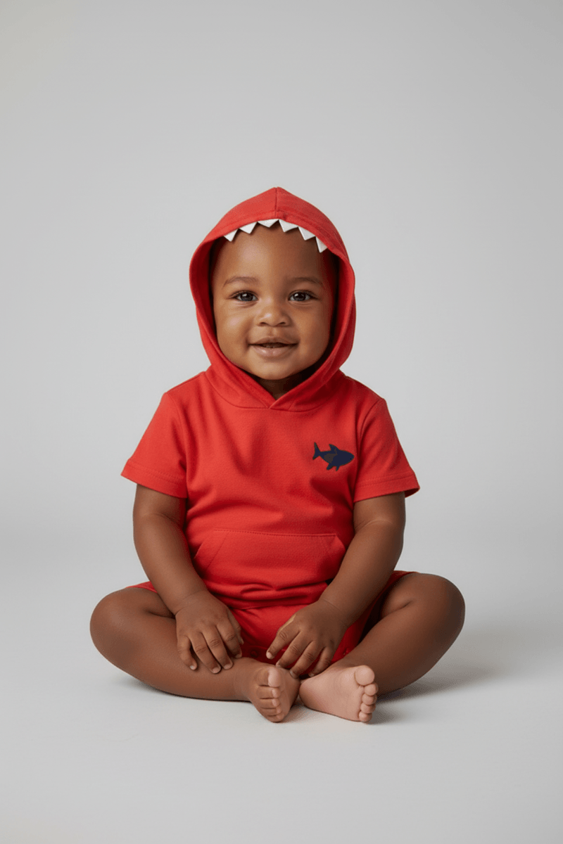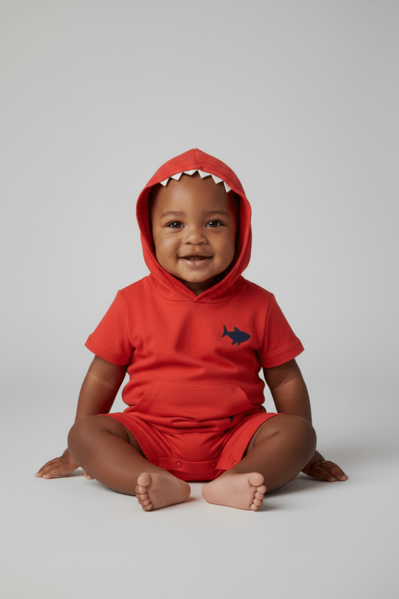 O Macaquinho Bebê Tubarão Vermelho Caedu oferece estilo e conforto para os pequenos. Com capuz divertido de tubarão, bordado exclusivo e botões de pressão, garante praticidade ao vestir. Uma roupa vibrante para a moda infantil, com preço bom que cabe no seu bolso.