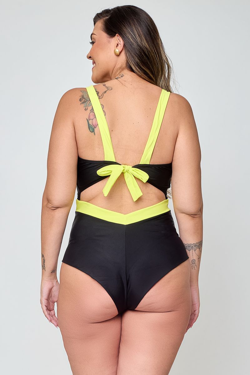 Modelo plus size. Maiô preto com detalhe em lima. Elegante e perfeito para dias de sol.
