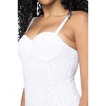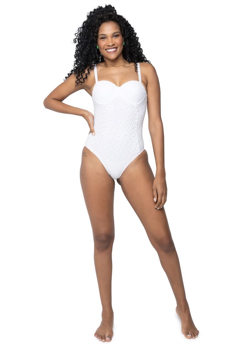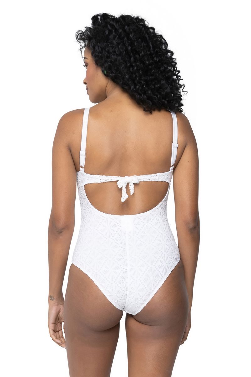 Maiô liso na cor branca, com decote cavado nas costas e amarração. Linda e super moderna, a peça ajusta-se delicadamente ao corpo. O modelo elegante proporciona um visual muito charmoso para os dias de verão na piscina ou praia.