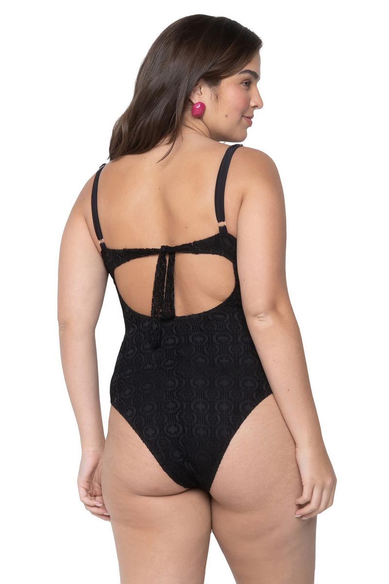 Maiô liso na cor preta, com decote cavado nas costas e amarração. Linda e super moderna, a peça ajusta-se delicadamente ao corpo. O modelo elegante proporciona um visual muito charmoso para os dias de verão na piscina ou praia.