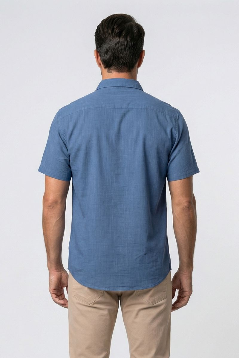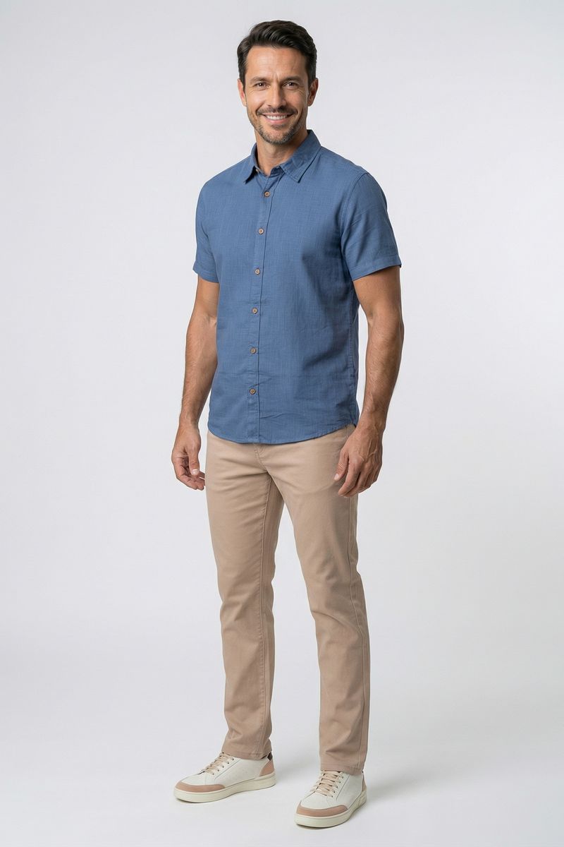 Experimente o conforto e o estilo da Camisa Masculina Casual Azul Médio Efeito Linho Manga Curta Caedu. Confeccionada em 100% algodão com tecido alfaiataria e um charmoso efeito linho, esta roupa masculina é perfeita para quem busca versatilidade e elegância na moda casual. Combine estilo e conforto em um só produto.