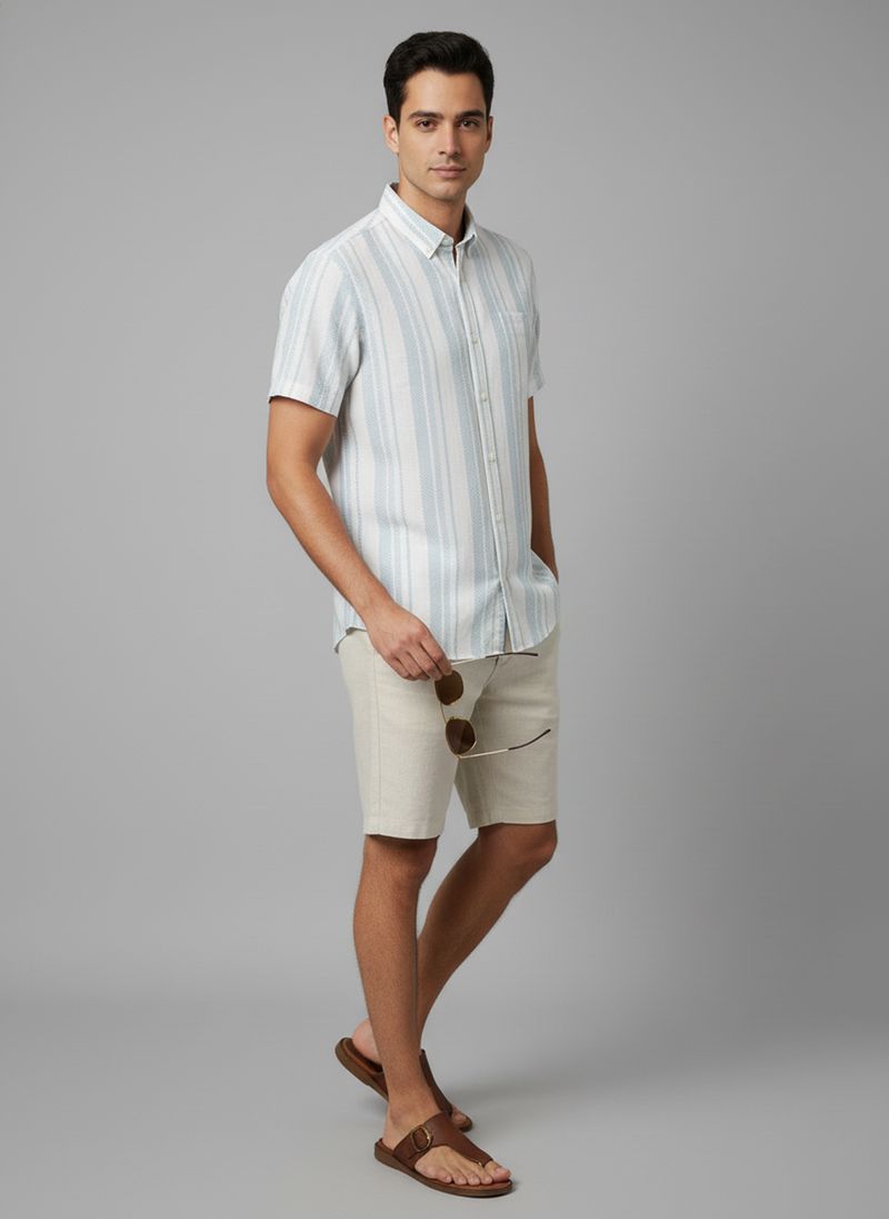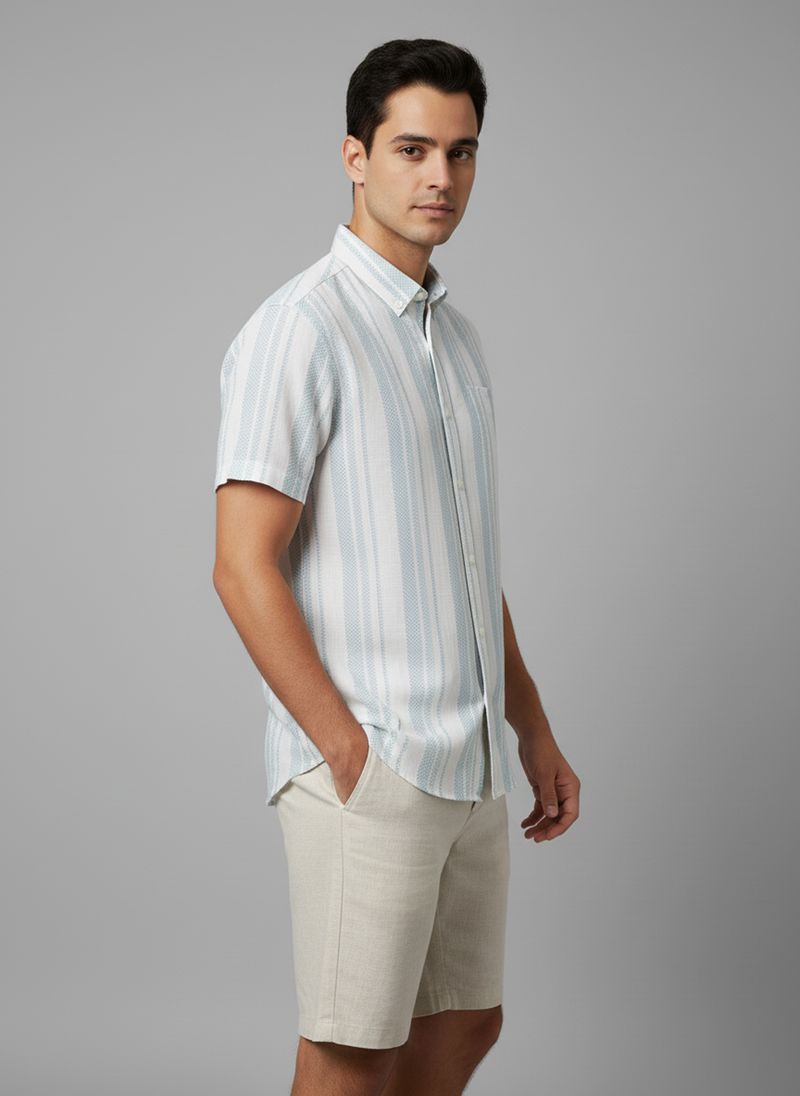 Eleve seu estilo com a Camisa Masculina Casual Listrada Efeito Linho Manga Curta Caedu. Confeccionada em 100% algodão, oferece conforto e toque suave. Seu design estampado com listras verticais e efeito linho proporciona um visual moderno e despojado, ideal para a moda masculina.