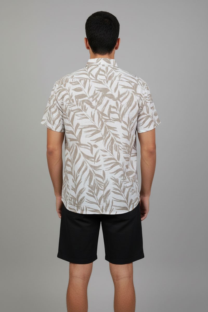 Combine sua camisa de folhagem com um shorts preto ou bermuda de sarja para um visual descontraído. Para um toque mais sofisticado, use com calça chino clara e sapatênis. Adicione óculos de sol e um relógio para completar o look. Perfeita para um estilo casual e moderno, esta roupa da Caedu se adapta a diversas composições.