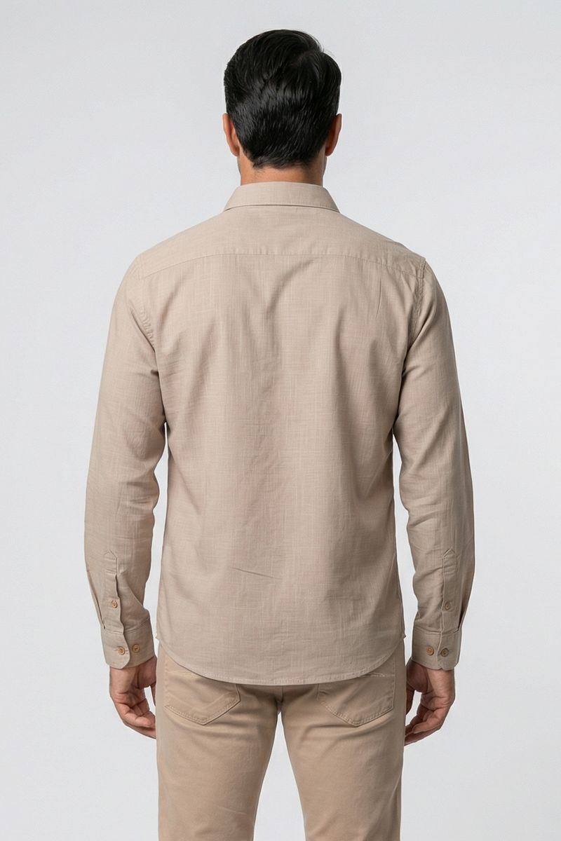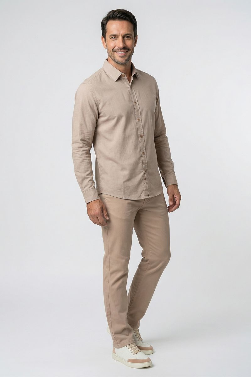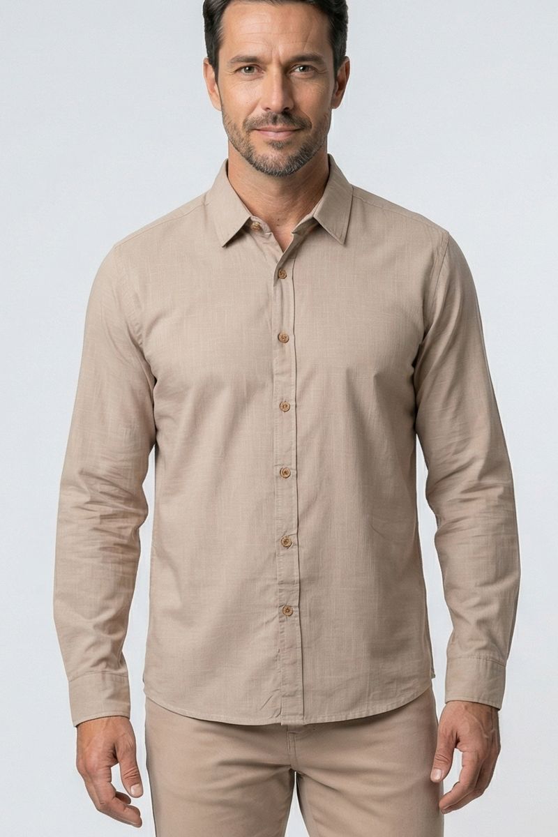 Eleve seu estilo com a Camisa Masculina Casual Manga Longa Linho Blend Bege Areia Caedu. Confeccionada em 100% algodão com textura rústica, oferece conforto e um caimento regular. Perfeita para um visual descontraído e elegante, esta peça versátil é um item essencial no guarda-roupa masculino.