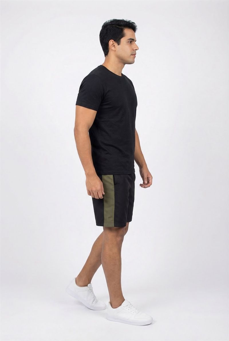 Eleve seu desempenho com o Shorts Masculino Esportivo Dry Fit Reciclado Caedu. Confeccionado em poliéster e elastano, este shorts preto com faixa lateral verde oliva oferece conforto e liberdade de movimento. Perfeito para quem busca estilo e sustentabilidade em suas roupas esportivas.