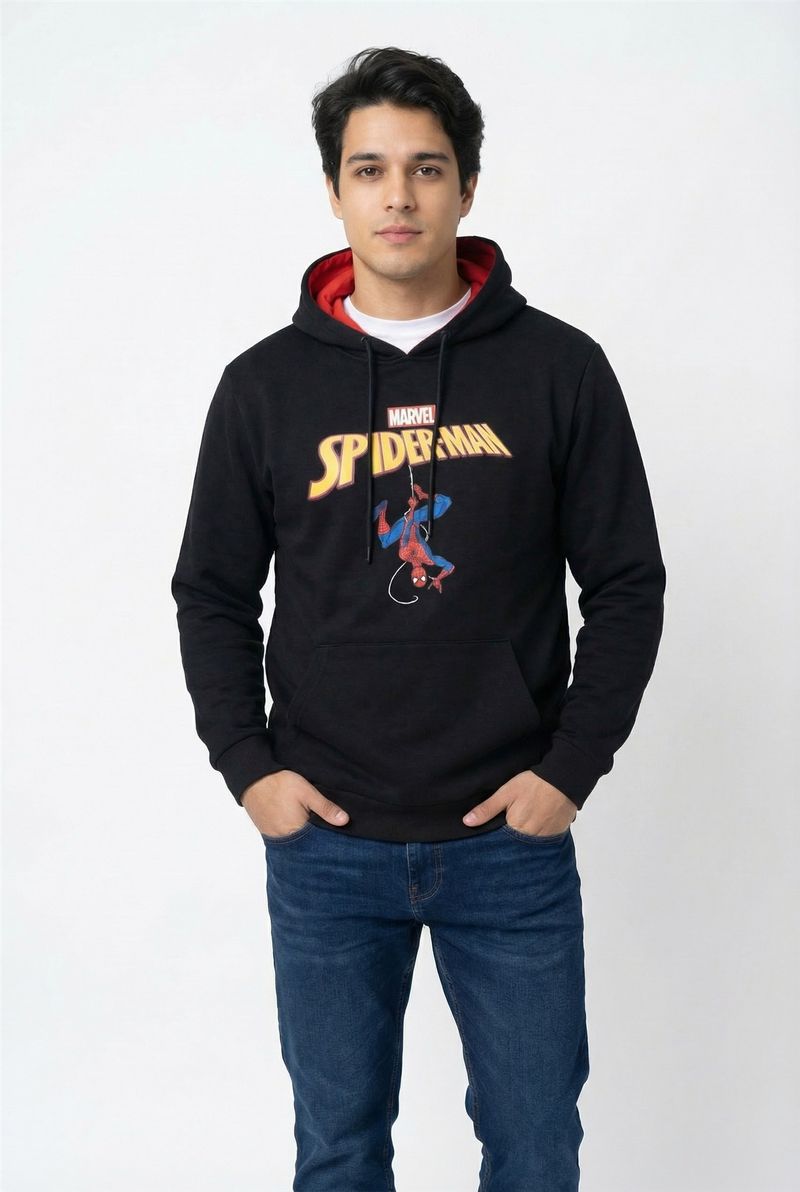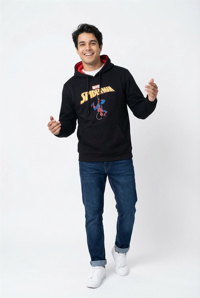 Detalhes: Capuz com forro vermelho, bolso canguru, estampa frontal Homem-Aranha Marvel, punhos e barra canelados