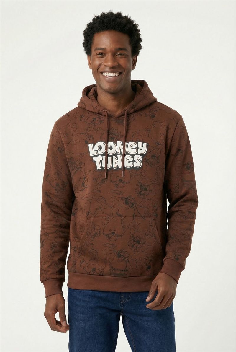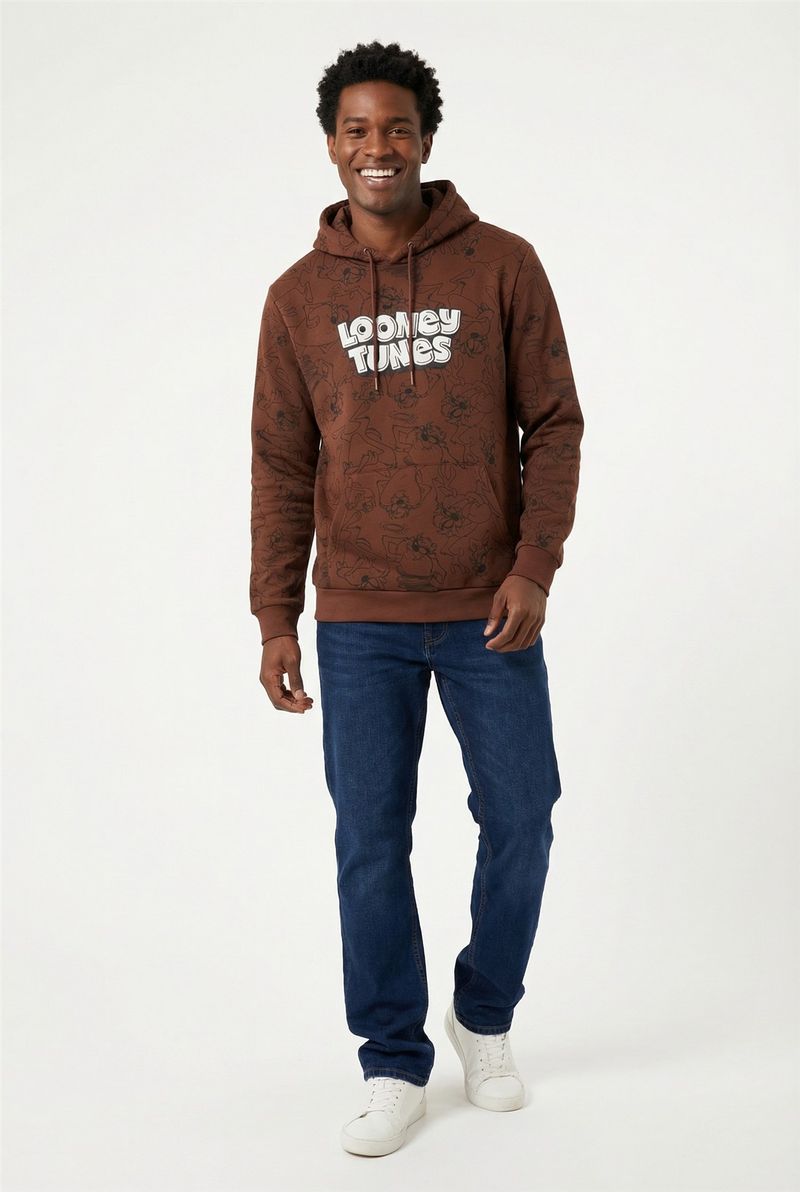 O Moletom Masculino Looney Tunes Caedu: moda e conforto. Marrom escuro, tom terroso em alta. 100% poliéster com felpa, estampa exclusiva Looney Tunes. Visual moderno e personalidade para suas roupas.