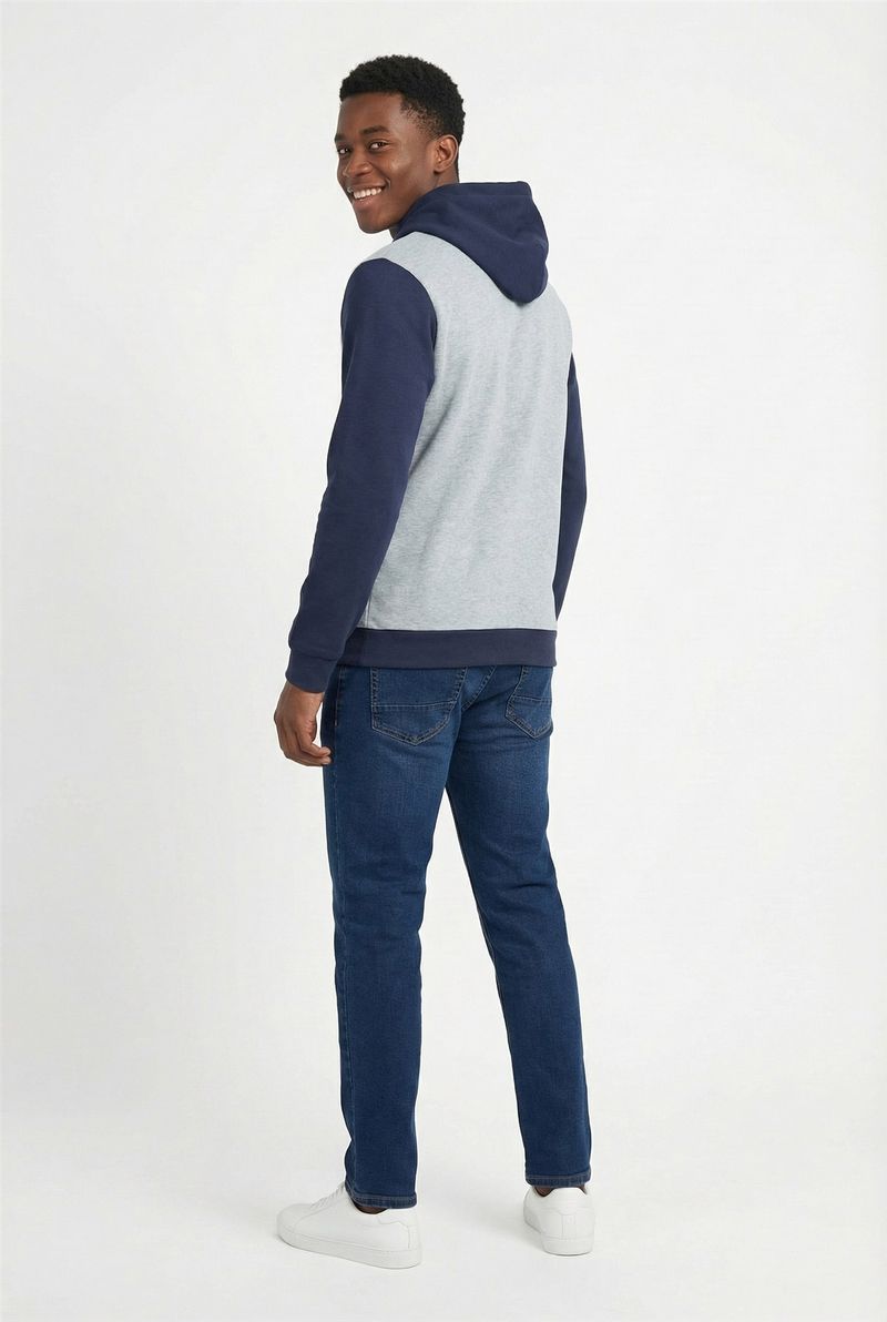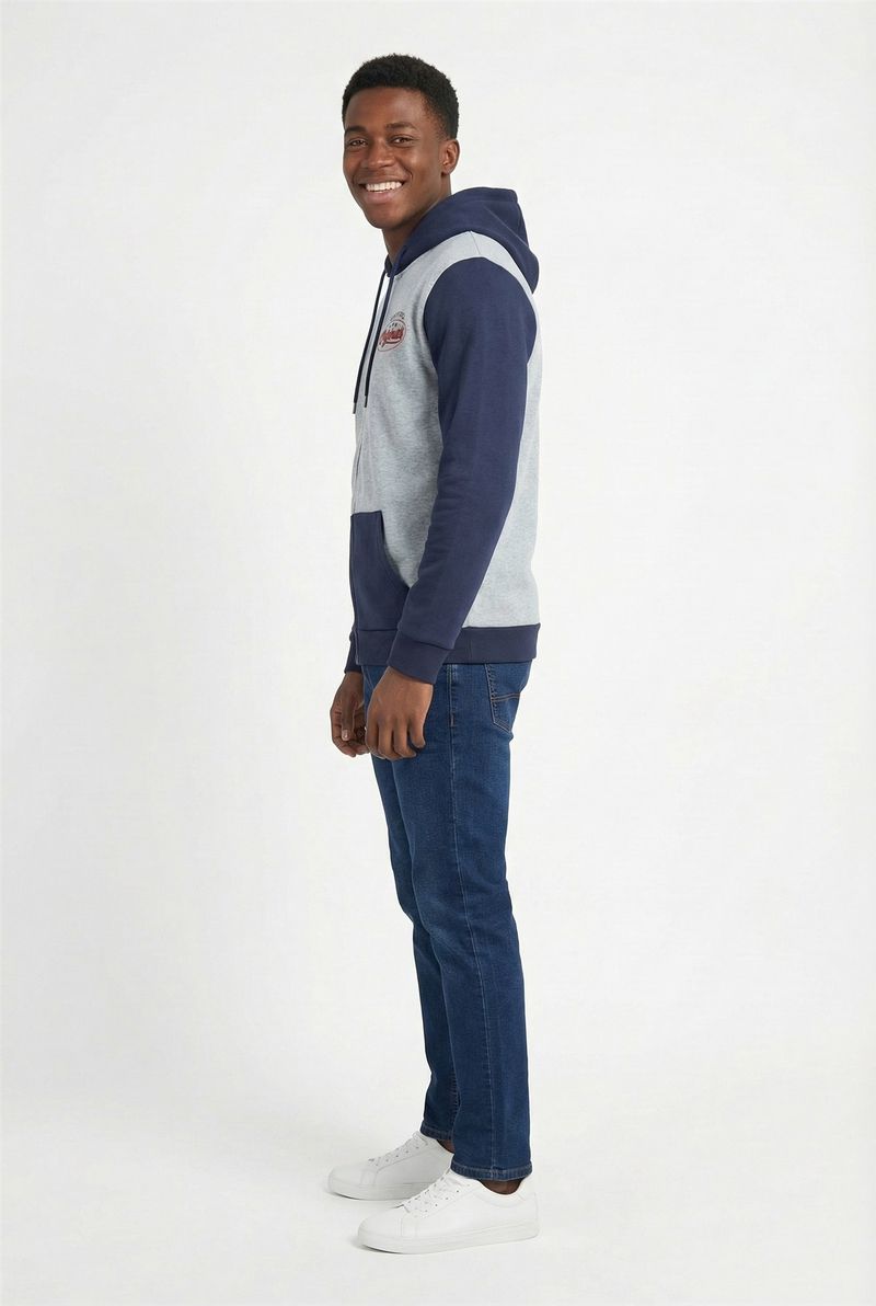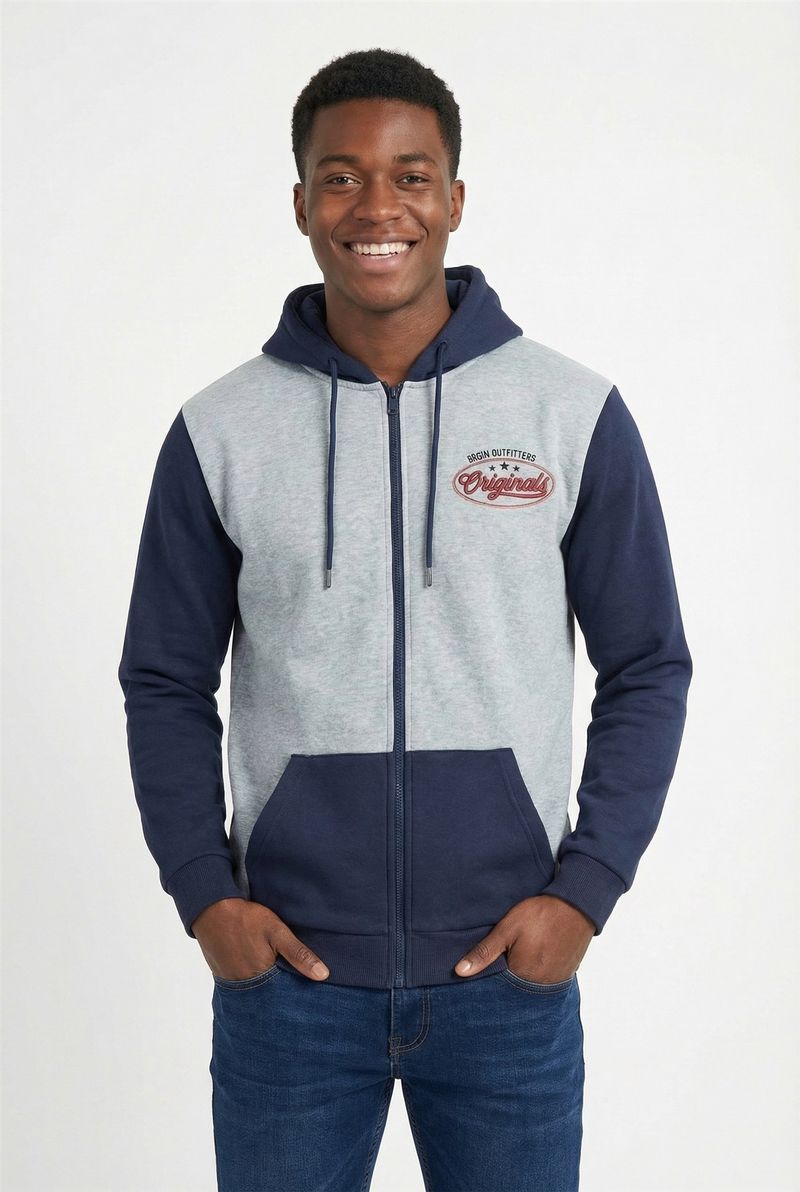 O Moletom Masculino Color Block Originals Caedu oferece conforto e estilo. Com design em cinza mescla e azul marinho, zíper e capuz, é feito de moletom com felpa 100% poliéster. Perfeito para a moda masculina.