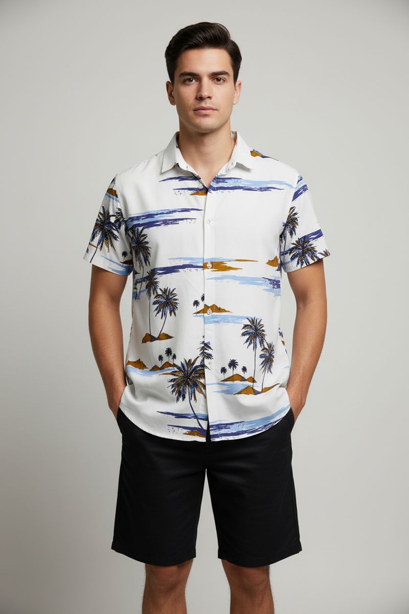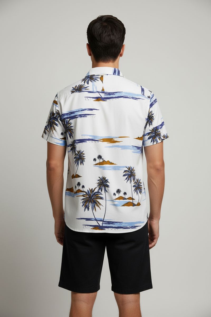 Experimente a Camisa Masculina Viscose Estampada Tropical Palmeiras. Em 100% viscose, oferece leveza e conforto. Sua estampa de palmeiras e vista mar é a roupa ideal para um visual despojado.