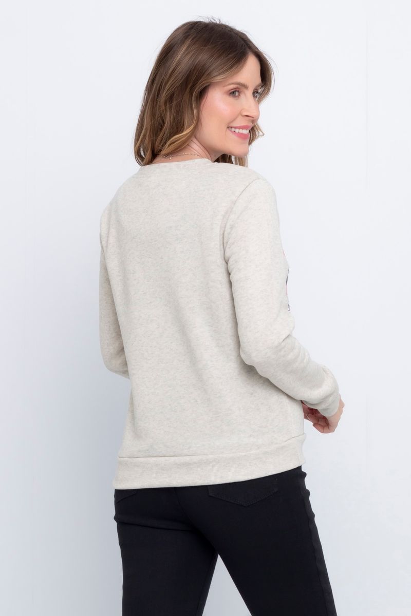 Blusão feminino confeccionado em moletom. A peça possui estampa, gola redonda e manga longa.