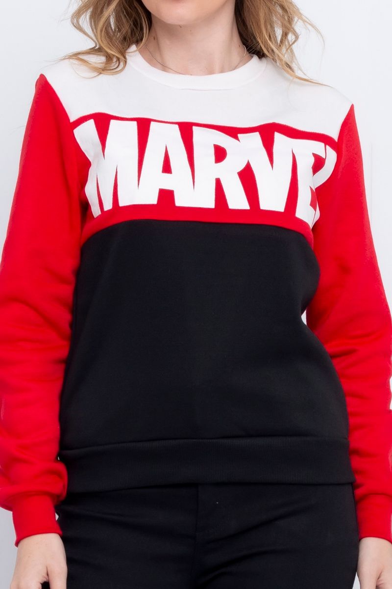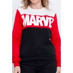 Blusão feminino confeccionado em moletom. A peça possui estampa Marvel, gola redonda e manga longa.