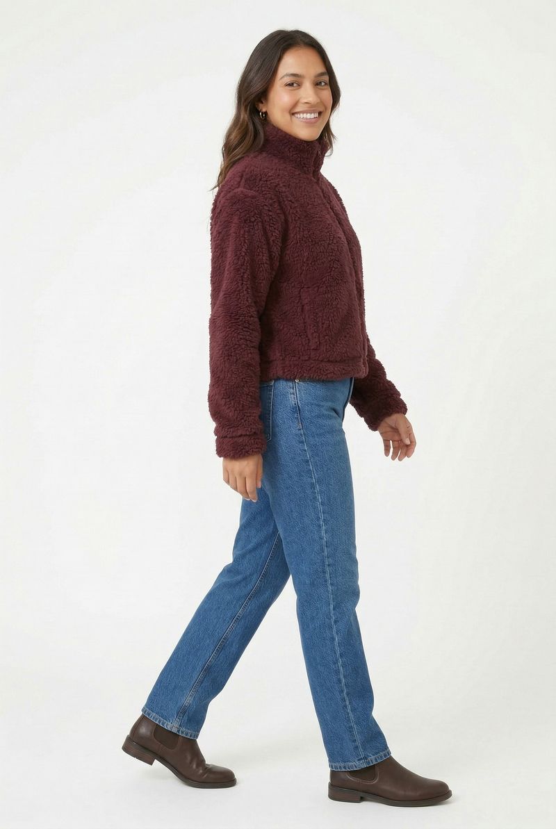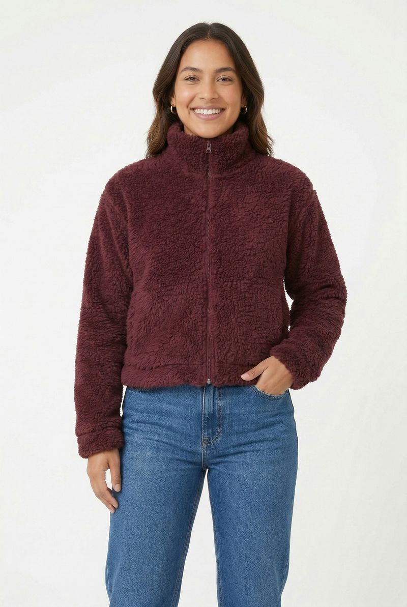 Detalhes: Textura felpuda sherpa, fecho de zíper frontal