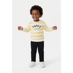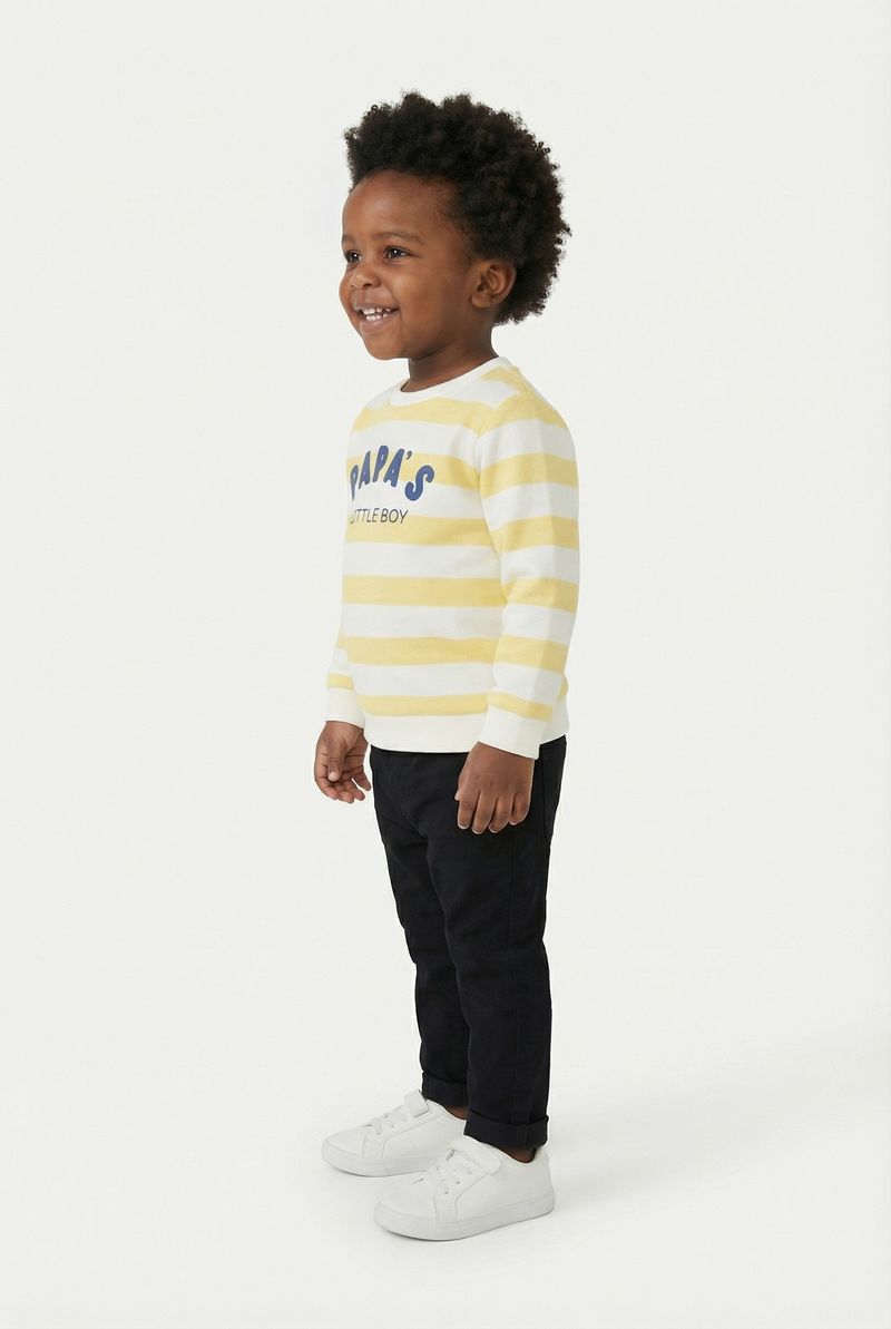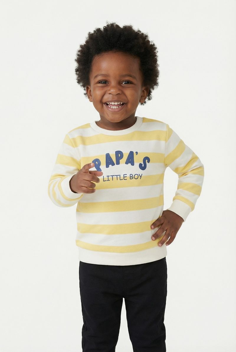 Estampa: Listras horizontais amarelas e off-white com "Papa's Little Boy"