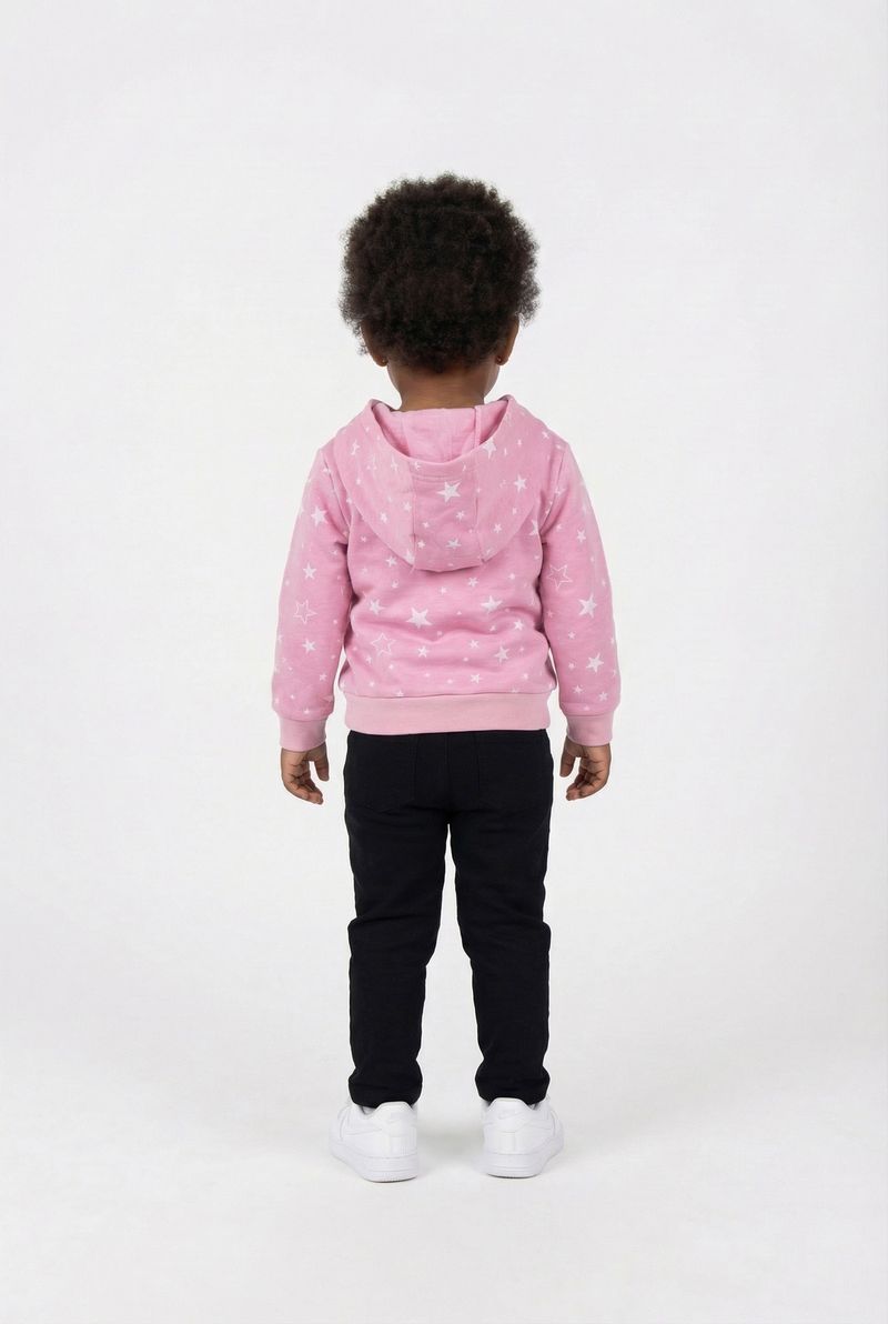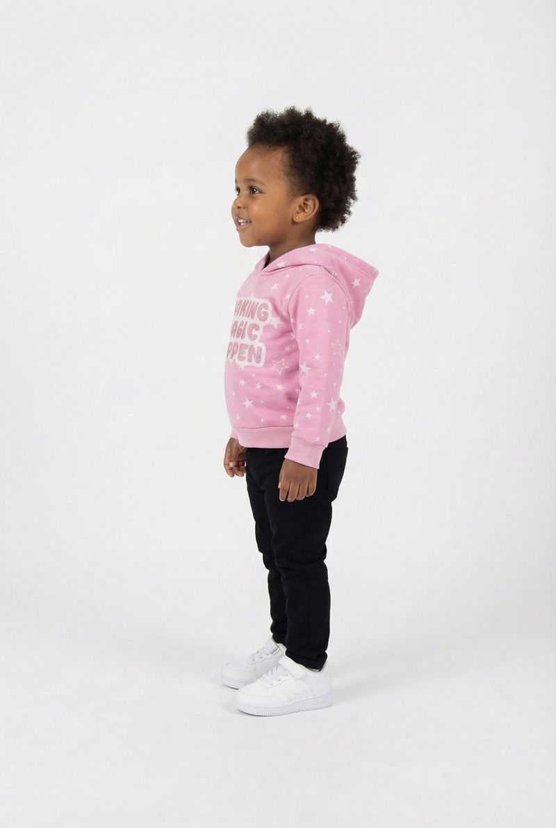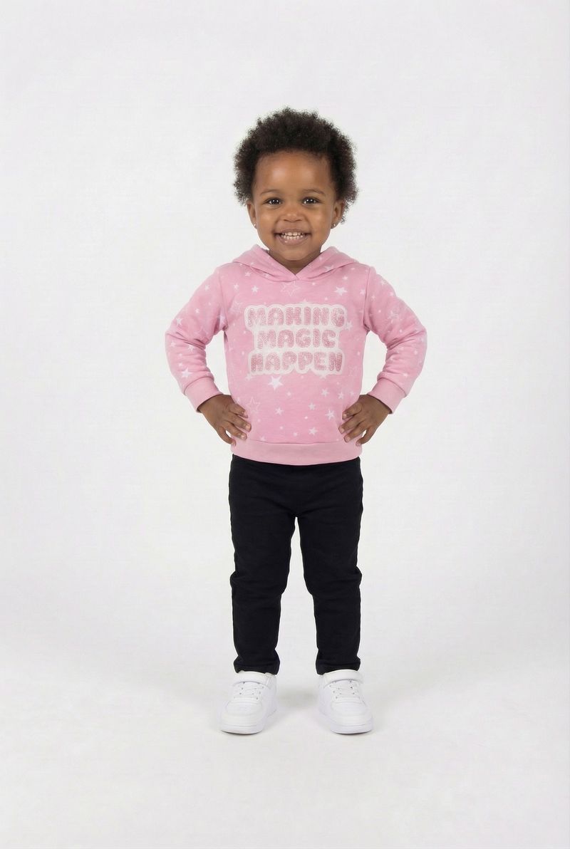 Detalhes: Capuz, estampa de estrelas e frase 'Making Magic Happen'