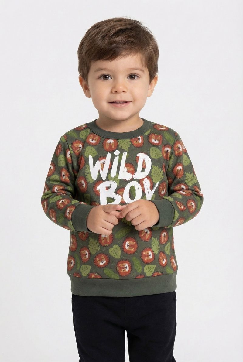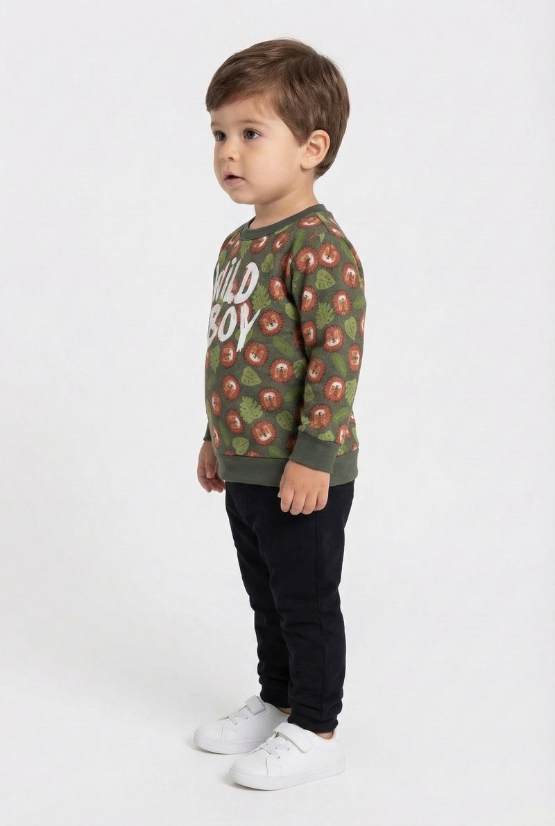 O Moletom Infantil Caedu 'Wild Boy', da nova coleção Outono Inverno, é perfeito. Em verde floresta, 100% algodão com felpa e estampa de leões, oferece conforto e estilo para os pequenos.