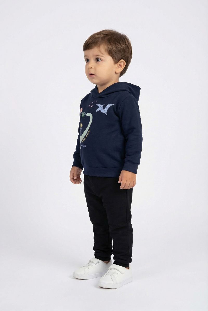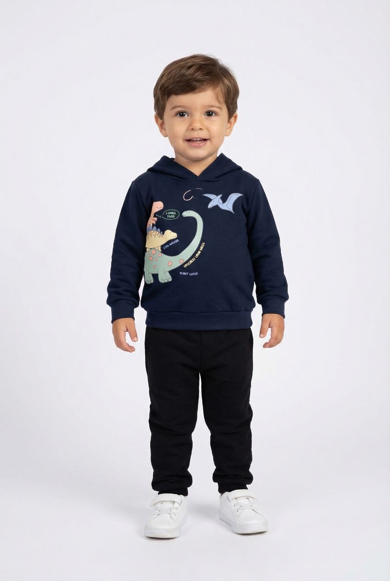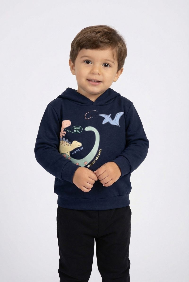 Conforto e estilo na nova coleção! O Moletom Infantil Dinossauros Marinho com Capuz Caedu, em 100% algodão, é ideal para crianças. Sua estampa vibrante de dinossauros inspira a imaginação. Perfeito para dias frescos.