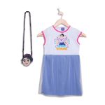 Camisola infantil sem manga, com estampa da personagem Luisa do filme Encanto, saia com tule e bolsa da personagem. O modelo tem estilo e garante maior mobilidade.