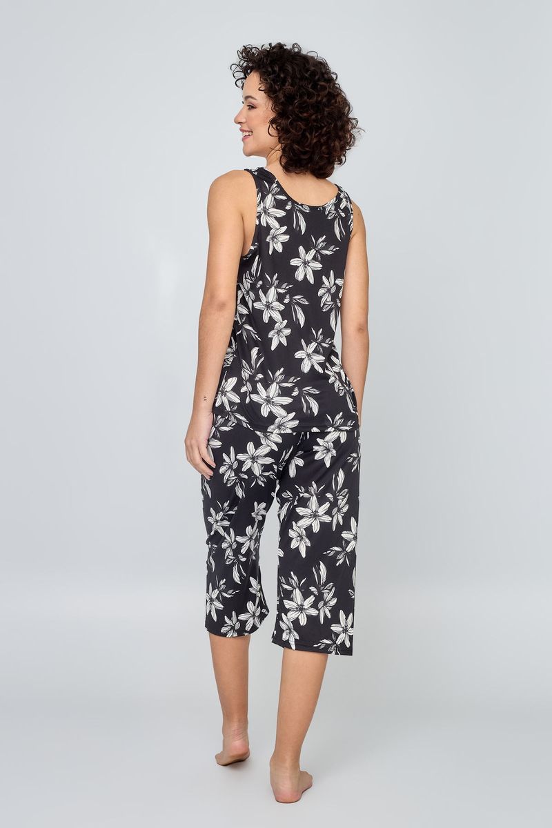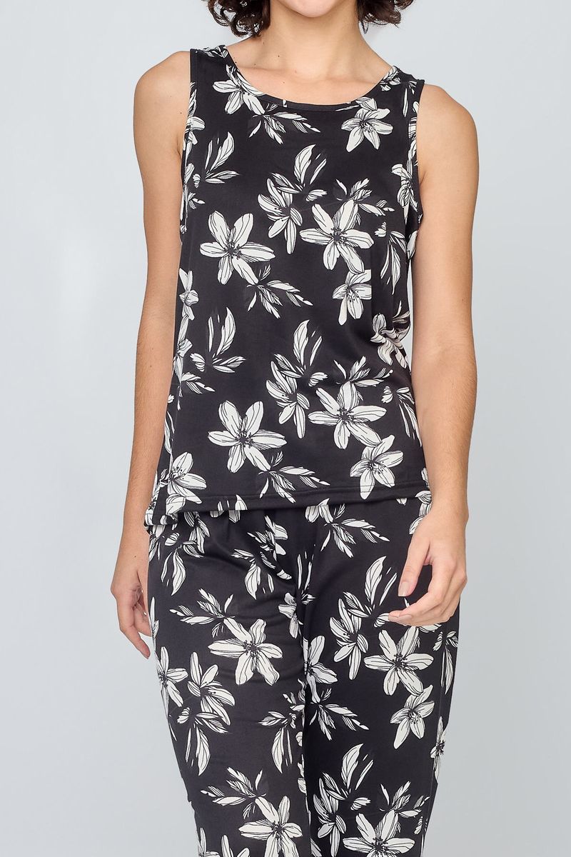 Pijama feminino preto em polybrush com estampa floral, confortável e elegante.