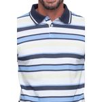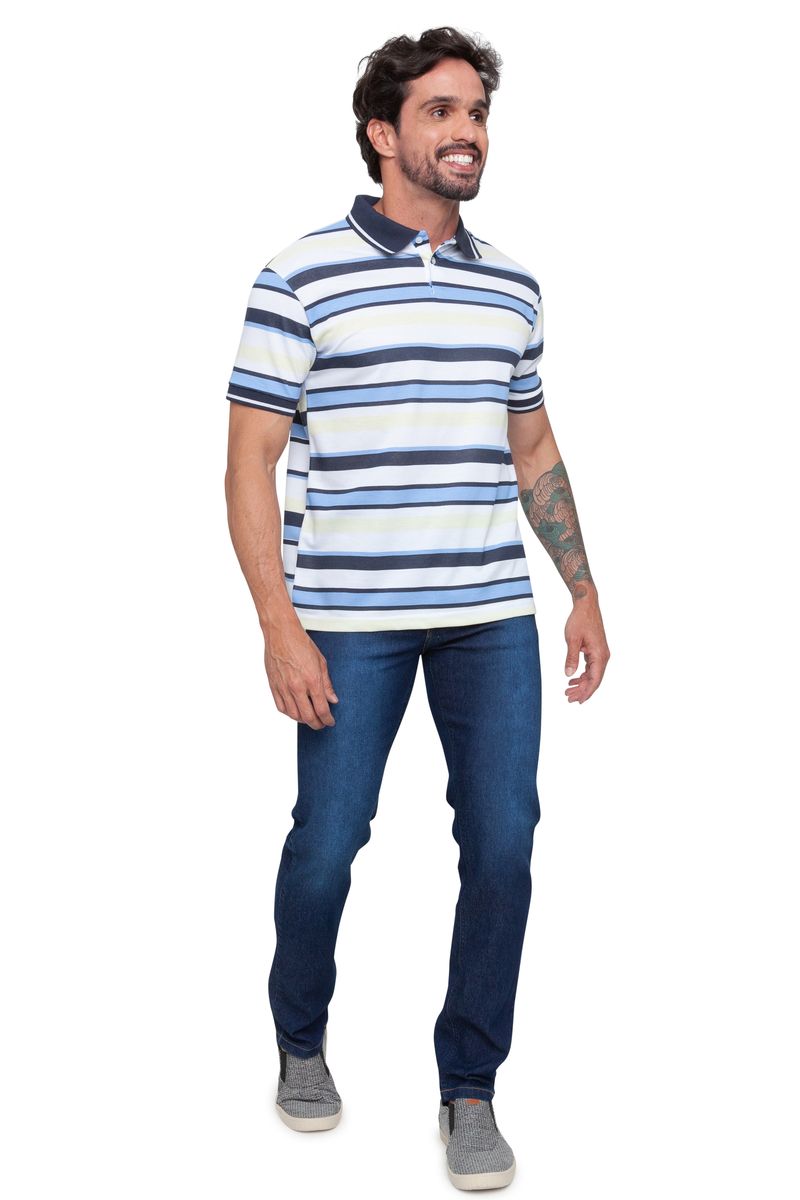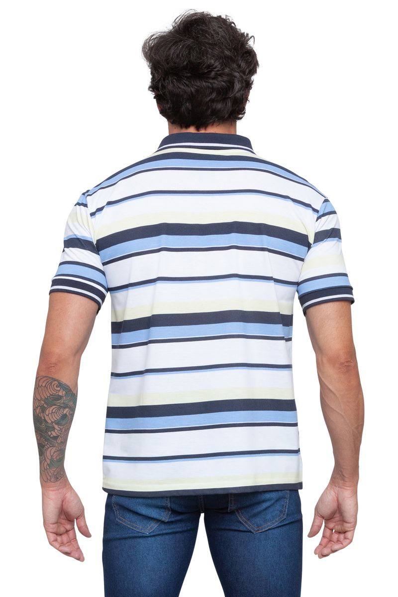 Polo manga curta com listras variadas azul claro e escuro e gola azul marinho. A peça é ideal para você que busca o complemento perfeito para os seus looks diários.