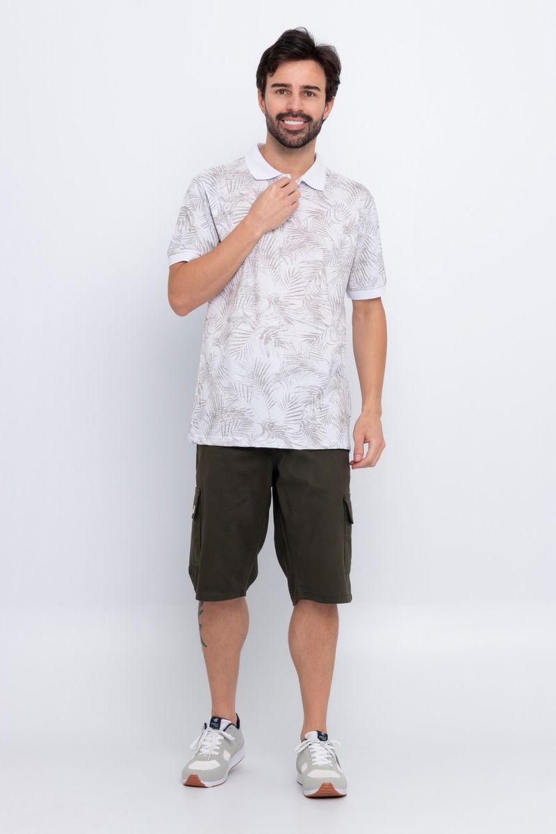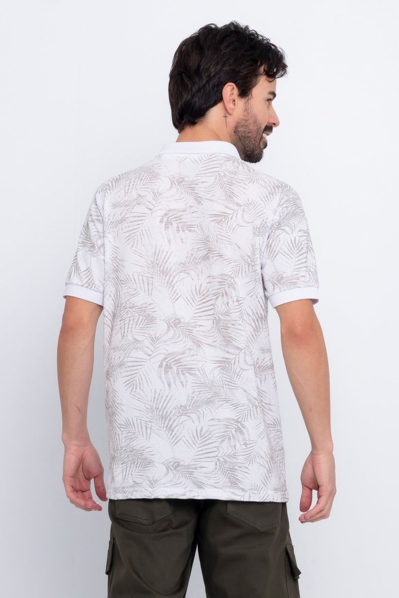 Polo Masculina em Piquet com Estampa Folhas Branca