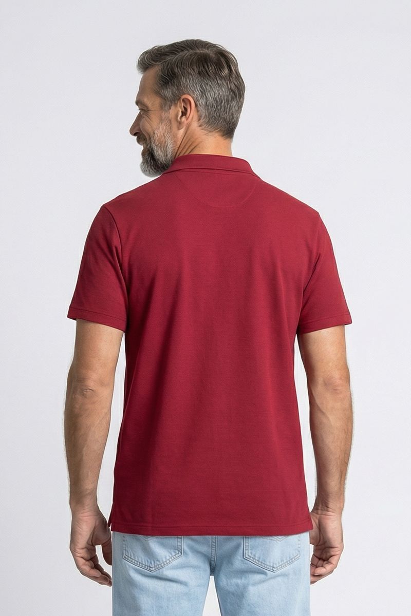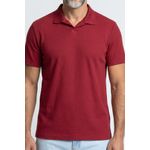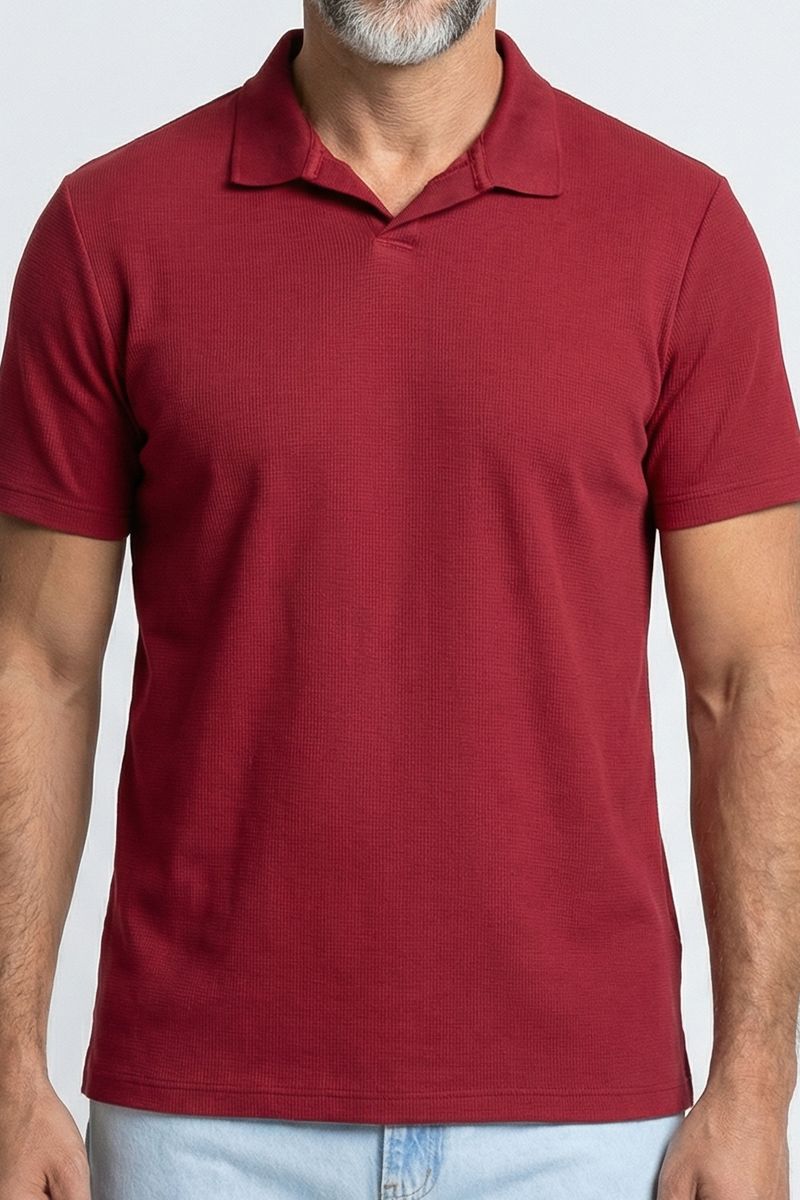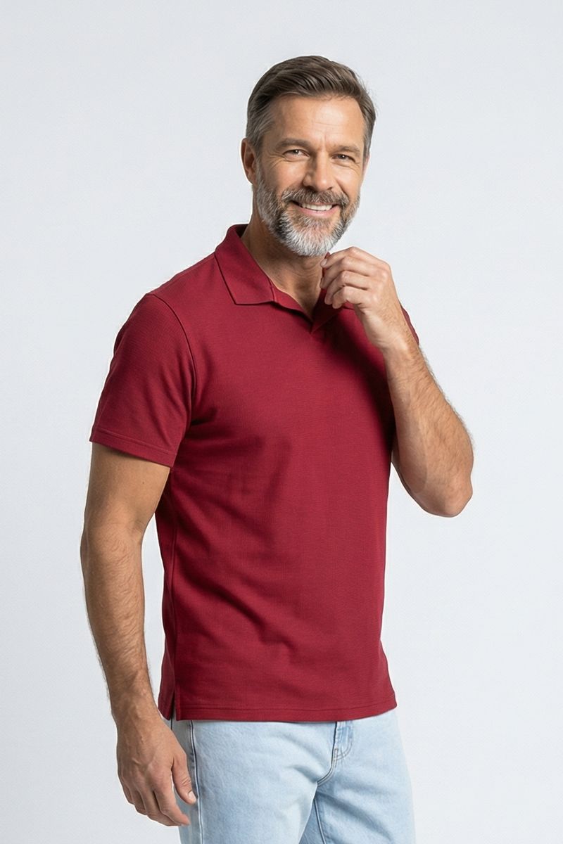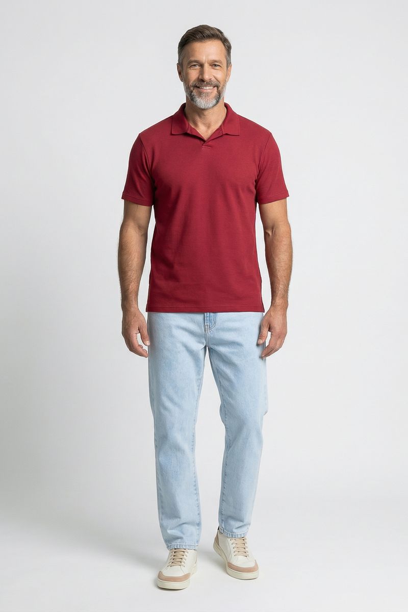 Eleve seu estilo com a Polo Masculina Caedu em vermelho borgonha. Feita em 100% algodão, oferece conforto e toque suave. Gola aberta e sem botões, visual moderno e casual para elegância e versatilidade.