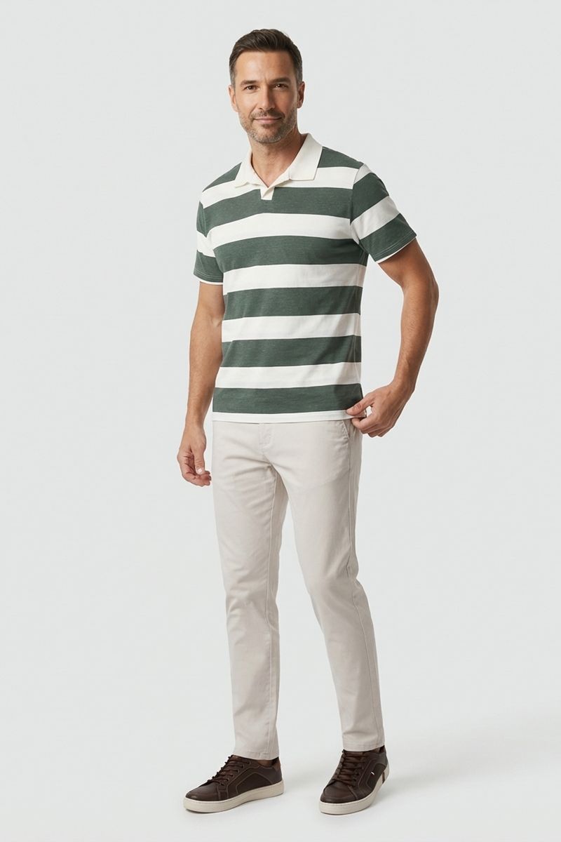 Combine sua polo com bermudas jeans para um visual despojado, ou com calças chino para um toque mais arrumado. Complete com tênis casuais ou sapatênis para um estilo versátil. Uma jaqueta leve pode ser adicionada em dias mais frescos.