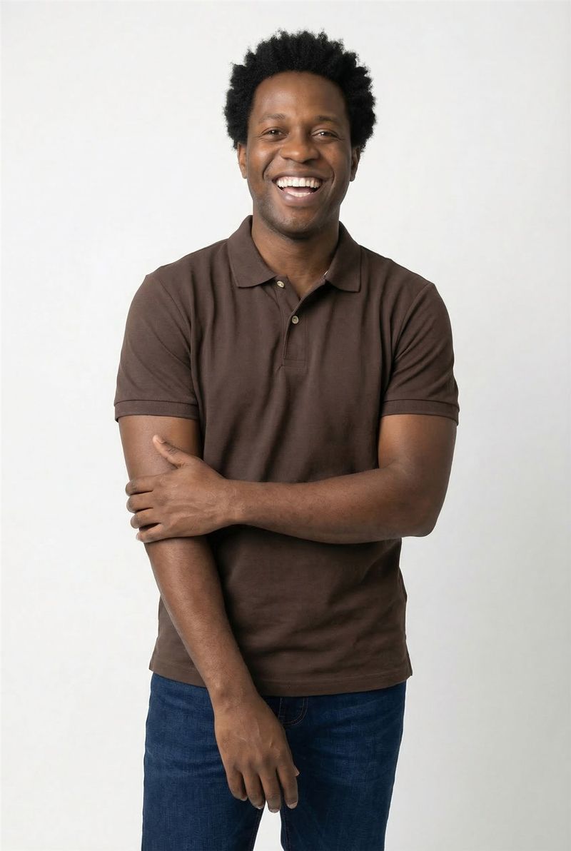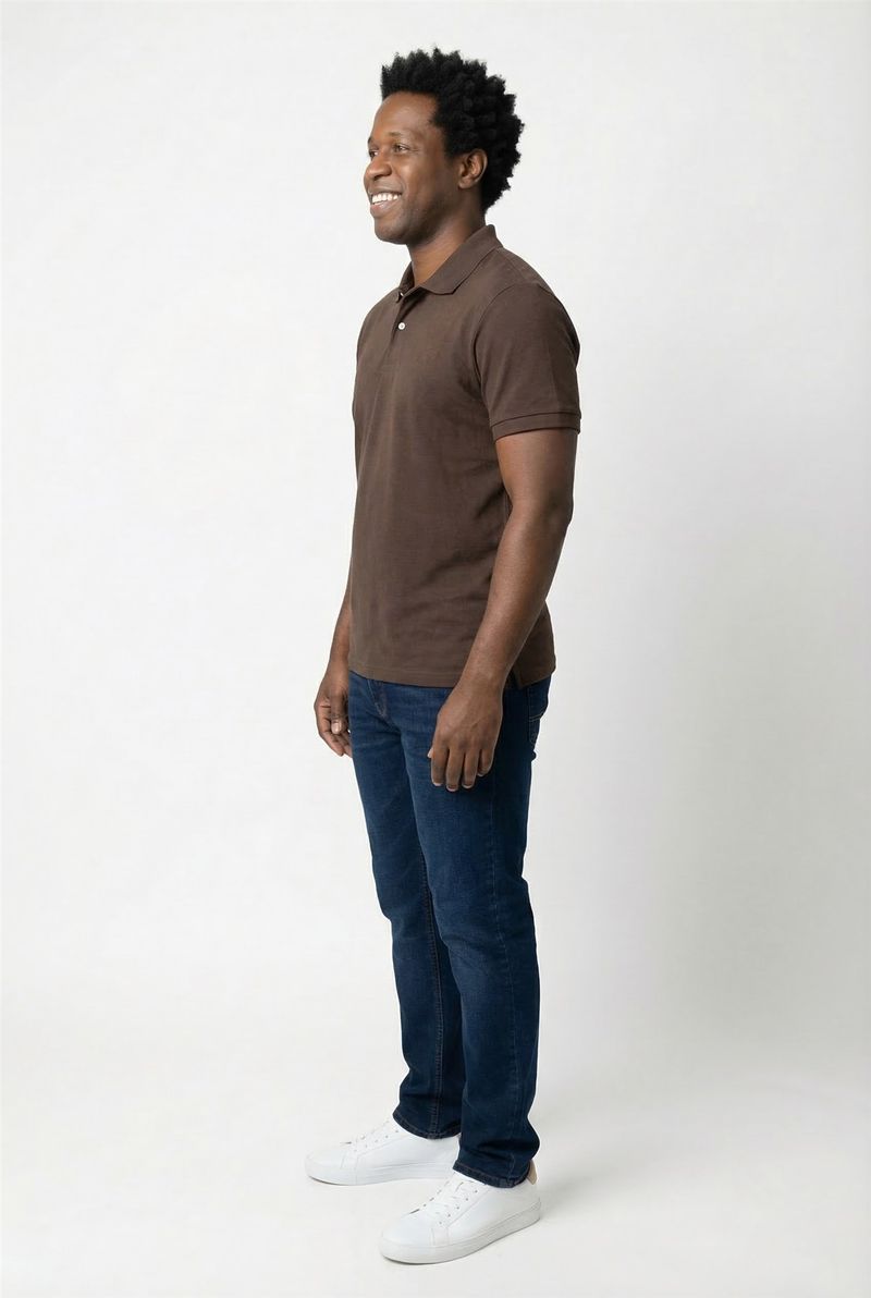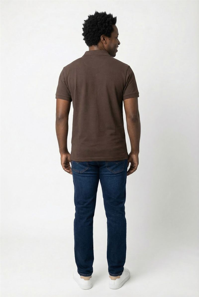 Combine a polo marrom escura com calça jeans azul escura para um visual casual. Para um toque sofisticado, use calças chino em tons neutros. Complete com tênis brancos ou sapatênis. Adicione uma jaqueta leve para um estilo versátil em dias frescos.