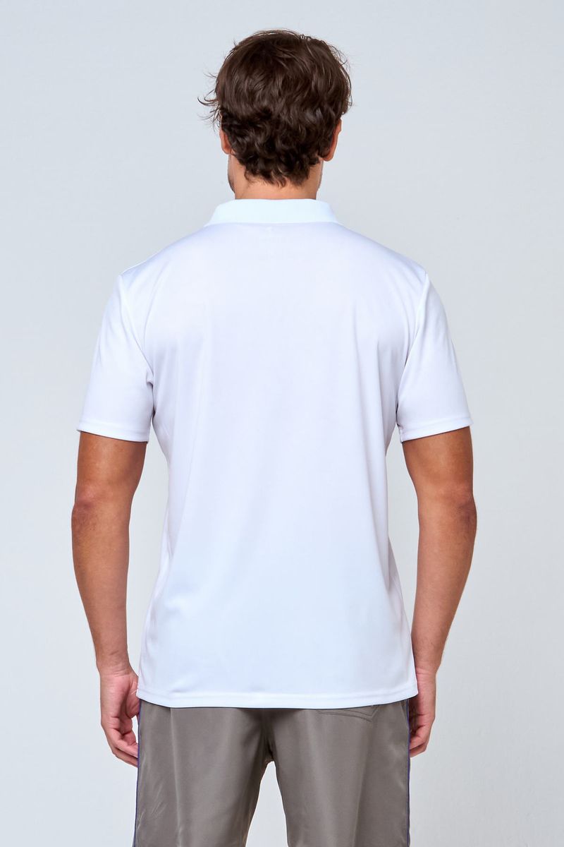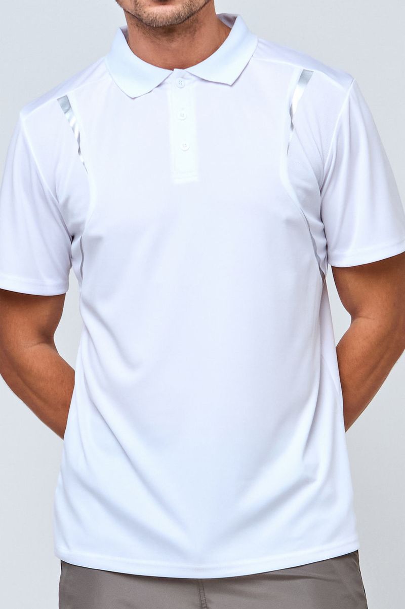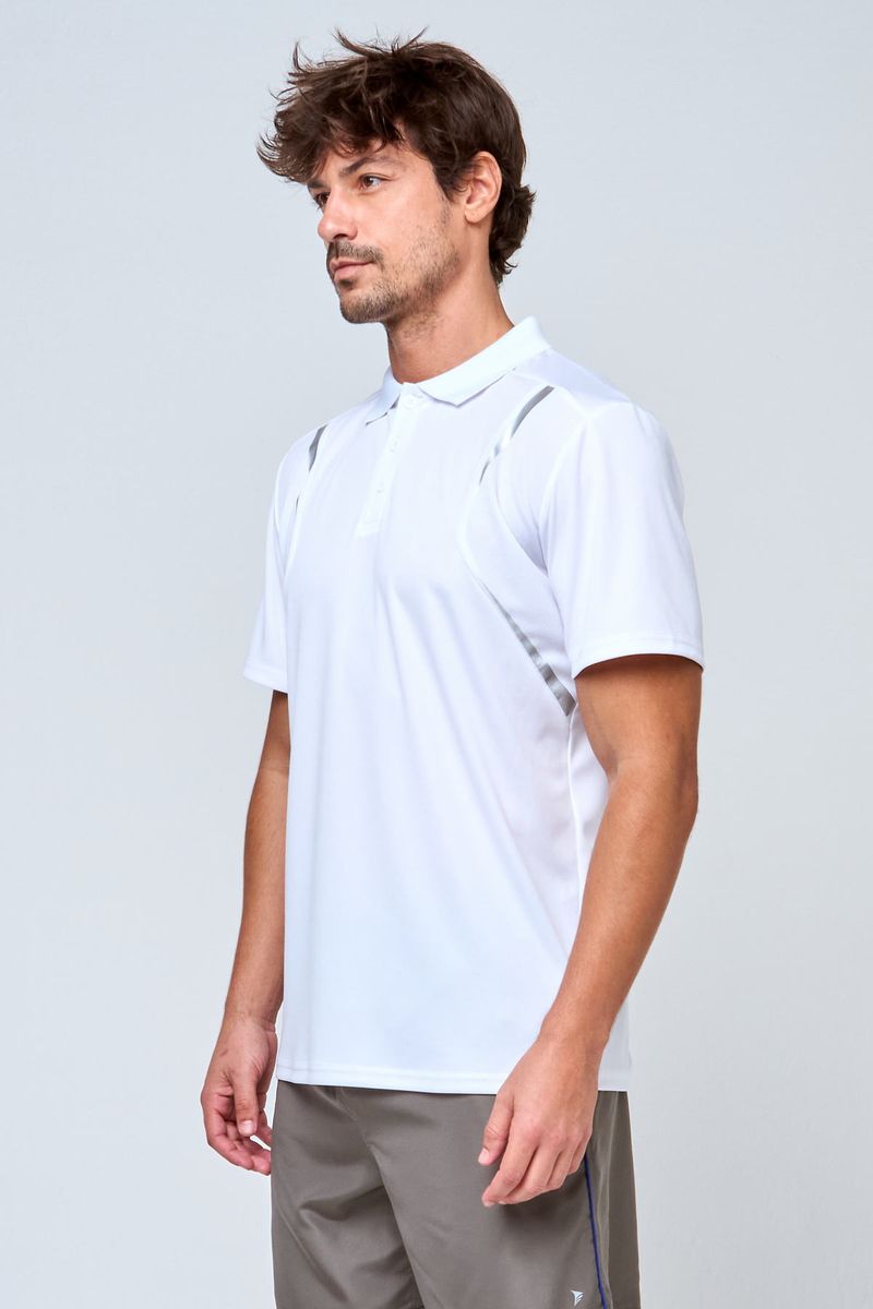 Polo masculina esportiva dry fit branca, ideal para atividades físicas.